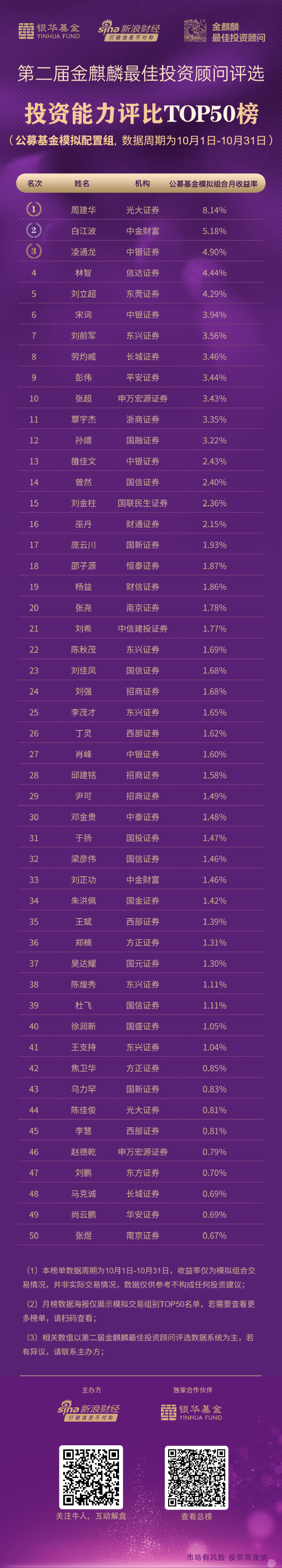 活动概况 - 第二届新浪财经金麒麟最佳投资顾问评选活动由新浪财经主办、银华基金独家合作,旨在寻找优秀投资顾问并赋能其IP建设 [1] - 评选活动包含股票模拟交易、场内ETF模拟交易、公募基金模拟配置及社交服务评比等多个维度,有万名投资顾问参与 [1] 公募基金模拟配置组十月业绩排名 - 在10月1日至10月31日的评比周期内,公募基金模拟配置组排名第一的是光大证券投顾周建华,月收益率为8.14% [1][2][4] - 排名第二的是中金财富投顾白江波,月收益率为5.18% [1][2][4] - 排名第三的是中银证券投顾凌通龙,月收益率为4.90% [1][2][4] - 排名第四至第十的投顾及其月收益率分别为:信达证券林智(4.44%)、东莞证券刘立超(4.29%)、中银证券宋词(3.94%)、东兴证券刘前军(3.56%)、长城证券劳灼威(3.46%)、平安证券彭伟(3.44%)、申万宏源证券张超(3.43%)[2][4] 参与机构分布 - 榜单前50名投顾来自多家证券公司,包括但不限于光大证券、中金财富、中银证券、信达证券、东兴证券、平安证券、国信证券、招商证券等 [2][3][4][5][6] - 部分投顾来自券商的特定部门或分公司,例如国信证券西南互联网分公司、南京证券财富管理部等 [2][3][4][5][6]