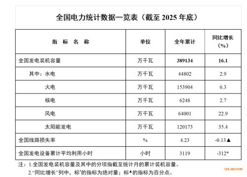 近日,国家能源局正式发布了2025年度全国电力统计数据。 | 全国电力统计数据一览表(截至2025年底) | | | | | --- | --- | --- | --- | | 指 标 名 称 | 单位 | 全年累计 | 同比增长 (%) | | 全国发电装机容量 | 万千瓦 | 389134 | 16.1 | | 其中:水电 | 万千瓦 | 44802 | 2.9 | | 火电 | 万千瓦 | 153904 | 6.3 | | 核电 | 万千瓦 | 6248 | 2.7 | | 风电 | 万千瓦 | 64001 | 22.9 | | 太阳能发电 | 万千瓦 | 120173 | 35.4 | | 全国线路损失率 | 00 | 4.23 | -0.13 A | | 全国发电设备累计平均利用小时 | 小时 | 3119 | -312* | | 全国电力统计数据一览表(截至2025年底) | | | | | --- | --- | --- | --- | | 指标 名 称 | 单位 | 全年累计 | 同比增长 (%) | | 全国发电装机容量 | 万千瓦 | 389134 | 16.1 | | 其中:水电 | 万 ...