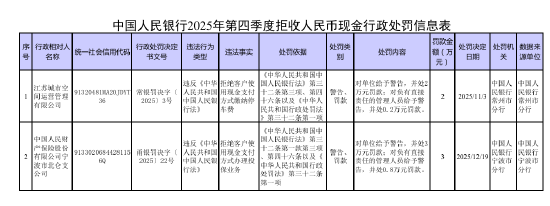 中国人民银行发布2025年第四季度拒收人民币现金行政处罚情况