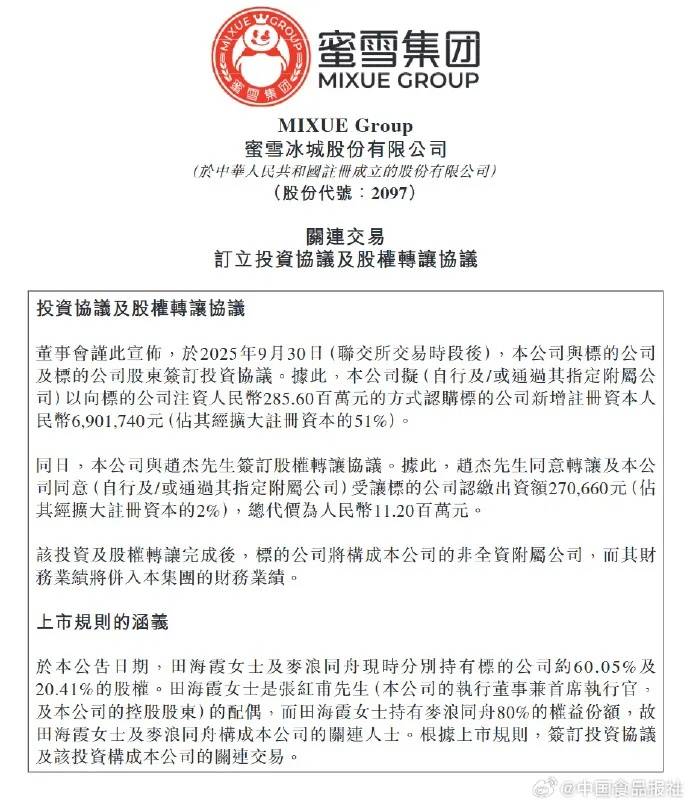 据中国食品报社消息:蜜雪冰城股份有限公司于10月1日发布公告称,其已在9月30日盘后与鲜啤福鹿家达成投资及股权转让协议——以约2.97亿元人民币 的价格获得鲜啤福鹿家53%的股权。完成投资后,蜜雪集团的产品品类将从现制果饮、茶饮、冰淇淋和咖啡延伸至现打鲜啤,进一步满足消费者对高质平 价产品的共同需求,践行"让全球每个人享受高质平价的美味"的使命。 本次交易被视作蜜雪冰城拓品的重要举措,切入现打啤酒赛道可通过依托双方"高质平价"共性,发挥供应链优势以及品牌势能,为鲜啤行业探索一条增长 新机遇。 据红星资本局报道:鲜啤福鹿家与蜜雪冰城、幸运咖一样,采用加盟模式扩张门店网络;产品定价也与蜜雪冰城、幸运咖价格区间相近。除了丰富产品品 类,推进加盟业务或也是本次投资的原因之一。 山西证券研报认为,蜜雪集团未来三大增长点分别为蜜雪冰城国内市场加密、幸运咖加盟发力、东南亚市场持续扩张。 截至2025年6月30日,蜜雪集团全球门店数超过53000家,国内门店数48281家。 2025年上半年,蜜雪集团录得收入148.7亿元,同比增加39.3%;其中商品和设备销售收入144.9亿元,同比增加39.6%;加盟和相关服务的收入3. ...