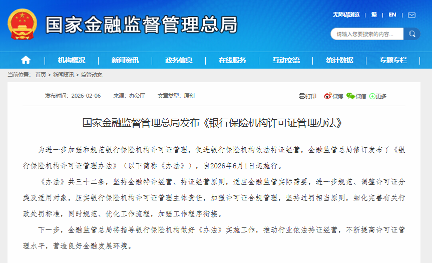 核心监管政策发布 - 国家金融监督管理总局于2月6日修订发布了《银行保险机构许可证管理办法》 该《办法》共三十二条 旨在加强和规范银行保险机构许可证管理 促进依法持证经营 并自2026年6月1日起施行 [1][3] - 本次修订坚持金融特许经营和持证经营原则 主要目的是规范许可证管理工作 其核心思路为“压实责任、严格执法、提升服务” [1][3] 许可证管理核心调整 - 《办法》进一步规范并调整了许可证的分类及适用对象 明确取消了原有的保险许可证 规定保险机构将统一适用金融许可证 以便于社会公众理解机构持牌经营情况 [1][3] - 修订内容着重压实银行保险机构在许可证管理上的主体责任 并强化了许可证的合规管理 [1][3] - 《办法》坚持过罚相当原则 细化并完善了相关的行政处罚标准 以严肃惩戒许可证管理使用中的违法违规行为 [1][3] - 在严格监管的同时 《办法》也注重优化工作流程 规范并加强工作程序衔接 旨在便利银行保险机构办事 提高效率 [1][3] 保险机构换证安排 - 自2026年6月1日起 所有保险机构将适用金融许可证 已持有原保险许可证的机构需在2026年6月1日至2028年5月31日的两年期限内 向金融监管总局或其派出机构申请换领新证并同步缴回旧证 [2][4] - 具体的换证工作将由各级监管部门根据辖内实际情况进行安排 在换证过渡期内 根据安排暂时仍持有原保险许可证的机构 其旧许可证在2028年6月1日前继续有效 [2][4]