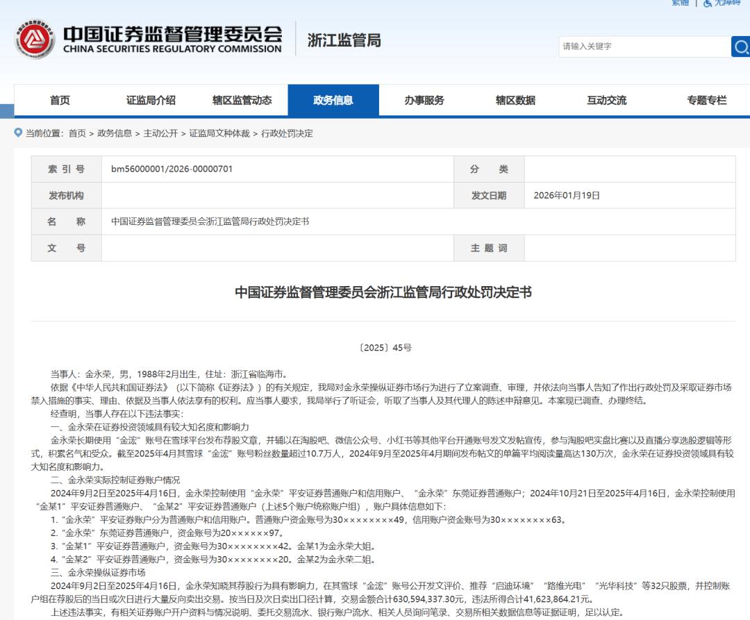 监管处罚与案件细节 - 中国证监会浙江监管局对雪球大V金永荣操纵证券市场行为作出行政处罚,罚没金额合计8324.78万元,并对其采取3年证券市场禁入措施 [1][3] - 金永荣使用“金浤”账号在雪球等平台发布荐股文章,其雪球账号粉丝超过10.7万人,2024年9月至2025年4月期间单篇帖文平均阅读量高达130万次 [1] - 在2024年9月2日至2025年4月16日期间,金永荣公开评价、推荐启迪环境等32只股票,并控制账户组在荐股后进行反向卖出交易,交易金额合计约6.31亿元,违法所得合计4162.39万元 [1] 当事人申辩与监管认定 - 金永荣及其代理律师从不具备影响力、无主观故意、帖文非荐股等方面提出申辩,但浙江证监局经复核后不予采纳 [3] - 监管认定“金浤”账号发布的荐股文章对相关股票价格和成交量有较大影响,帖文中的“不推荐买卖”等标注仅为形式免责,不影响其公开荐股及操纵市场的行为性质认定 [3] 平台专项治理行动 - 雪球平台启动专项治理,重点聚焦四类违规行为:过度炒作及操纵市场、非法证券投资咨询及违规导流、网络黑灰产及团伙化操作、编造传播虚假不实信息 [4] - 雪球将依法依约对违规账号采取警示、删除内容、禁言、关闭账号等梯度处置措施,并已于1月9日清理一批涉及“非法荐股”与“马甲水军”的账号 [4] - 1月20日,雪球安全中心对“杭州新城路”、“轮回666”等22个违规账户作出永久封禁处置 [9] 监管环境与协同整治 - 对网上虚假不实信息及违规荐股行为的打击已形成监管合力,国家网信办会同中国证监会在2025年12月19日依法处置了一批炮制谣言、非法荐股的账号 [9] - 在2026年证监会系统工作会议上,证监会表示将严肃查处过度炒作乃至操纵市场等违法违规行为,坚决防止市场大起大落 [10]