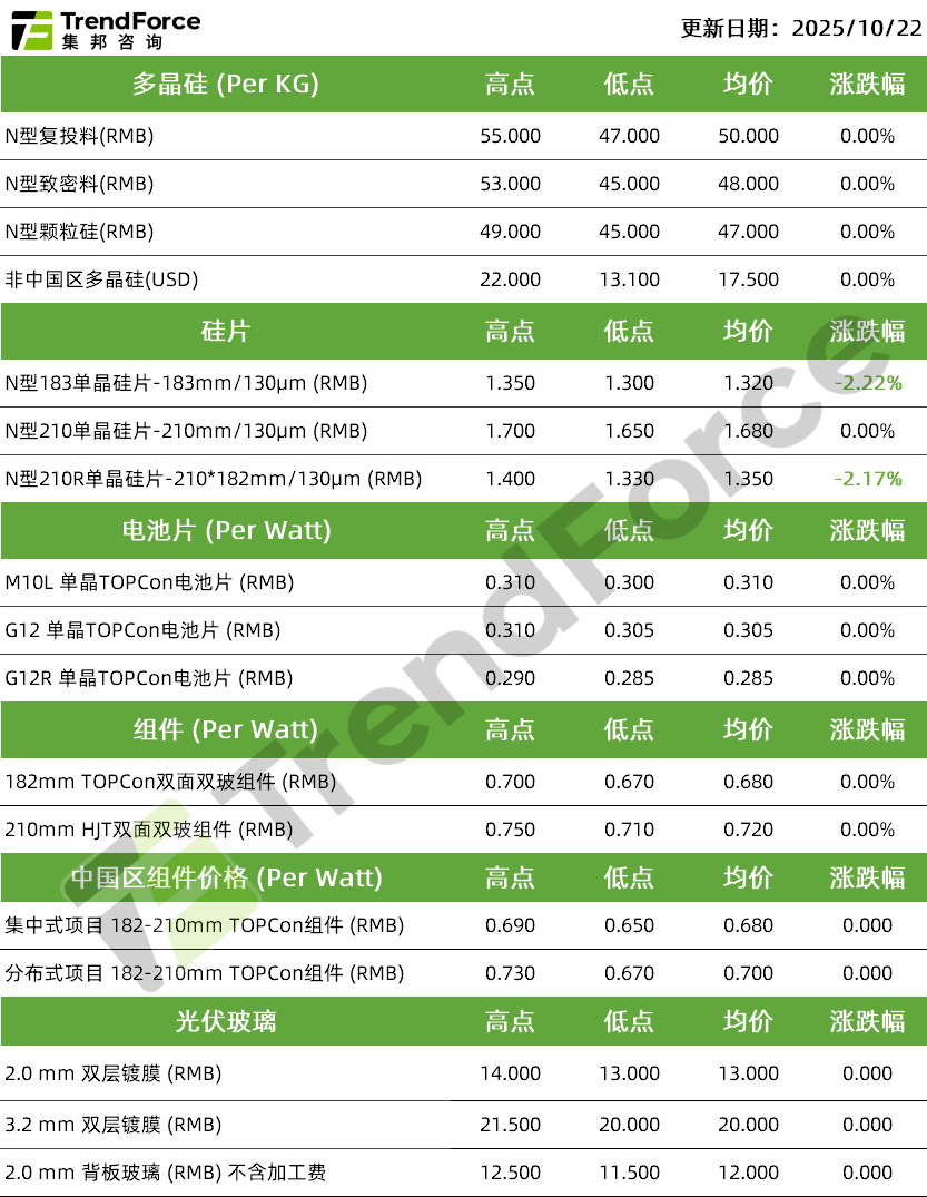 多晶硅 - 行业整体库存约42万吨以上,并有继续累库趋势,主要因下游拉晶厂库存仍处高位且采购策略趋于谨慎 [2] - 11月多晶硅龙头四川与云南生产基地计划停产,新特准东产能爬坡及宁夏东方希望试车增量有限,预计11月整体产出环比减少约1万吨 [2] - 尽管企业有意推高价格,但实际成交价未涨,预计11月-12月价格将保持"有价无市"的高位持稳局面 [1][2]   硅片 - 当前硅片库存约20GW,环比上周增加约1亿片,专业化硅片厂连续累库,210RN库存压力持续,183次之,210N维持紧平衡 [3] - 市场压力下企业策略分化,头部企业报价坚挺,二三线企业为缓解库存压力继续低价出货,导致整体成交价格重心下移 [3] - 从尺寸结构看,183N、210RN价格承压下行且后市仍有下行趋势,210N因阶段性需求旺盛价格坚挺 [3]   电池片 - 当前电池库存维持在5-7天左右,库存以210RN为主,183N尺寸因印度需求回落库存有上升趋势,210N库存极低 [4] - 183N电池受印度需求回落影响价格重心下移,210RN价格低位持稳,210N因国内少量集中式项目交货预期价格支撑较强,后市或有小幅上涨 [4] - 终端需求低迷,但在价格政策指导下电池厂、贸易商均在挺价,10月底电池厂面临减产或降价风险 [4]   光伏组件 - 组件终端需求疲软,主要以国内少量集中式项目为主,国内分布式及海外需求相对低迷 [5] - 720W版型需求旺盛,报价普遍上调至0.7元/W以上且成交良好,组件厂库存较低,后续价格有继续上行动力 [5] - 常规版型组件库存高企,价格多集中在0.65-0.68元/W左右且出货困难,终端需求疲软导致企业后续储备订单不足,全产业链价格整体或将承压下行 [5]   价格数据 - N型183单晶硅片均价为1.320元,周环比下跌2.22%,N型210单晶硅片均价为1.680元,周环比持平 [7] - M10L单晶TOPCon电池片均价为0.310元/W,G12R单晶TOPCon电池片均价为0.285元/W,周环比均持平 [7] - 集中式项目182-210mm TOPCon组件均价为0.680元/W,分布式项目均价为0.700元/W [7]
