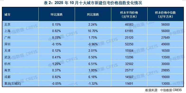 撰文|包晶晶 编辑|陈梦妤 封面|每日经济新闻资料图 楼市"银十",上海新房价格同比涨幅依然超过了10%。 不仅如此,据中指研究院《中国房地产指数系统百城价格指数报告》,十大城市中,有8个城市10月份新房价格同环比均上涨。 | | 环比涨跌 | 同比涨跌 | 样本平均价格 | 样本价格中位数 | | --- | --- | --- | --- | --- | | | | | (元平方米) | (元/平方米) | | 北京 | 0.15% | 2.24% | 46583 | 56000 | | 上海 : 9 | 0.82% | 10.70% | 61185 | 56000 | | 广州 | 0.33% | 1.75% | 25120 | 27649 | | 深圳 | -0.15% | -0.96% | 52250 | 49000 | | 天津 | 0.12% | 2.01% | 15504 | 16500 | | 武汉 皇家 | 0.41% | 0.50% | 13296 | 13500 | | 杭州 | 1.20% | 6.51% | 32502 | 30000 | | 南京 | 0.37% | 1.95% ...
