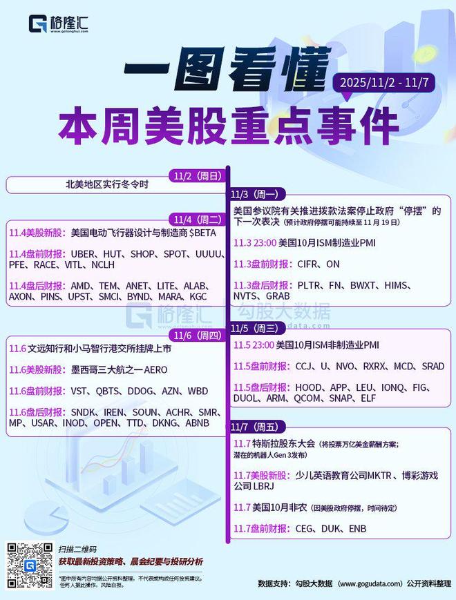 宏观经济事件 - 美国10月ISM制造业PMI将于11月3日23:00公布 [2] - 美国10月ISM非制造业PMI将于11月5日23:00公布 [2] - 美国10月非农就业报告因政府停摆时间待定 [2] - 美国参议院有关推进拨款法案的表决预计政府停摆可能持续至11月19日 [2] - 北美地区于11月2日起实行冬令时 [2] 美股新股上市 - 美国电动飞行器设计与制造商BETA于11月4日上市 [2] - 墨西哥三大航空公司之一AERO于11月6日上市 [2] - 少儿英语教育公司MKTR和博彩游戏公司LBRJ于11月7日上市 [2] 港股新股上市 - 自动驾驶公司文远知行和小马智行于11月6日在港交所挂牌上市 [2] 重点公司财报(11月3日-11月4日) - 11月3日盘前财报公司包括CIFR和ON [2] - 11月3日盘后财报公司包括PLTR、FN、BWXT、HIMS、AXON、PINS、UPST、SMCI、BYND、MARA、KGC、NVTS、GRAB [2] - 11月4日盘前财报公司包括UBER、HUT、SHOP、SPOT、UUUU、PFE、RACE、VITL、NCLH [2] - 11月4日盘后财报公司包括AMD、TEM、ANET、LITE、ALAB [2] 重点公司财报(11月5日-11月7日) - 11月5日盘前财报公司包括CCJ、U、NVO、RXRX、MCD、SRAD [2] - 11月5日盘后财报公司包括HOOD、APP、LEU、IONQ、FIG、DUOL、ARM、QCOM、SNAP、ELF [2] - 11月6日盘前财报公司包括VST、QBTS、DDOG、AZN、WBD [2] - 11月6日盘后财报公司包括SNDK、IREN、SOUN、ACHR、SMR、MP、USAR、INOD、OPEN、TTD、DKNG、ABNB [2] - 11月7日盘前财报公司包括CEG、DUK、ENB [2] 重点公司事件 - 特斯拉将于11月7日举行股东大会,将投票表决万亿美金薪酬方案,并可能发布机器人Gen 3 [2]