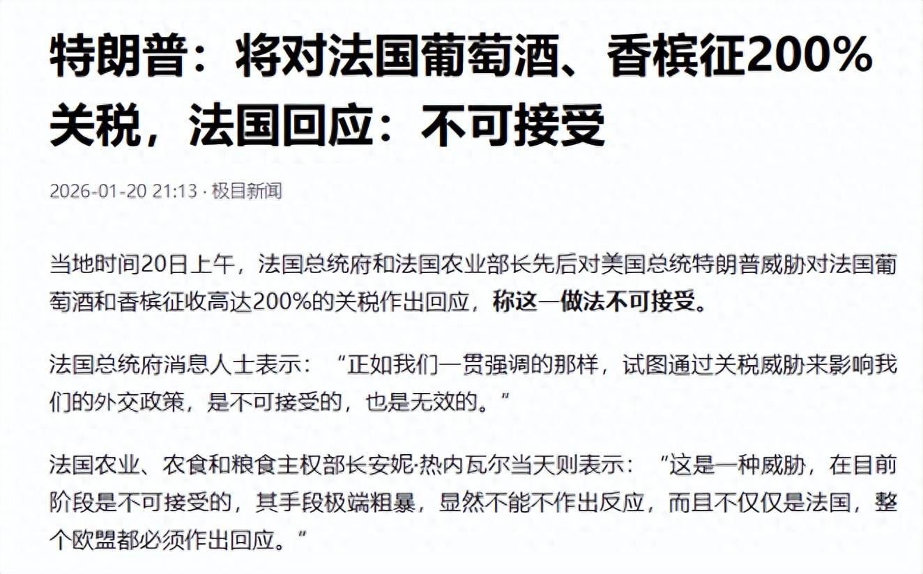 格陵兰岛争端与美欧贸易摩擦 - 美国前总统特朗普在2025年再次上任后,强烈推动购买格陵兰岛的想法,并在2026年持续散播“格陵兰事关全球安全”的言论 [2] - 作为回应,丹麦于2026年1月14日联合多国在北极地区展开“北极耐力”军事演习,明确表态格陵兰岛不可买卖,法国也于1月15日派遣十余名军人驻扎格陵兰岛以示政治信号 [2] - 特朗普对此反应激烈,于2026年1月17日公开点名法国、德国、英国、丹麦、瑞典、挪威、芬兰、荷兰八国,威胁从2月1日起对这些国家的商品加征10%关税,直至各国就购买格陵兰岛达成协议 [4] - 2026年1月19日,中方敦促美方遵守联合国宪章和国际法基本原则 [6] 加沙问题与美法贸易冲突 - 2026年1月16日,特朗普宣布成立由其操控的“加沙和平委员会”,邀请60多个国家和国际组织加入,该机制旨在绕开联合国并让美国掌控中东话语权 [9] - 2026年1月19日,法国总统马克龙以缺乏国际合法性、可能削弱联合国作用为由,明确拒绝加入该委员会 [10] - 作为对法国拒绝的报复,特朗普宣布将对法国的葡萄酒和香槟征收200%的关税 [10] - 法国农业部长当天回应称该关税威胁“不可接受”,因葡萄酒和香槟是法国的经济支柱和文化象征 [12] 关税作为政治工具的影响与历史参照 - 特朗普已将关税作为政治惩罚工具,其策略是瞄准目标国家最疼痛的经济领域进行打击 [12] - 以2025年3月的先例为参照,当时欧盟因美国钢铝关税宣布对美国威士忌等产品加征关税,特朗普曾威胁对欧盟所有葡萄酒和香槟加征200%关税 [12] - 历史数据显示,欧盟每年向美国出口超过50亿美元的葡萄酒,法国占据其中近一半份额,加征200%关税可能导致一瓶50美元的香槟价格飙升至90美元 [12] - 2025年的关税威胁导致美国进口商停单,并使法国小型酿酒商面临现金流断裂的风险,同时美国进口商也因此裁员,对全球供应链造成扭曲 [12]