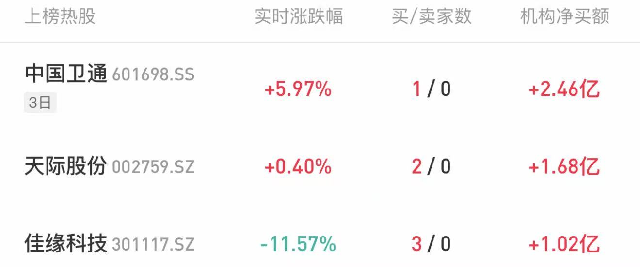 龙虎榜机构热股 一、数字人民币 据央视新闻报道,中国人民银行已经出台《关于进一步加强数字人民币管理服务体系和相关金融基础设施建设的行动方案》,新一代数字人民币计量框架、 管理体系、运行机制和生态体系将于2026年1月1日正式启动实施。 根据方案部署,从2026年1月1日起,数字人民币钱包余额将按照活期存款计付利息。 翠微股份 今天机构龙虎榜上榜36只个股,净买入17只,净卖出19只。当日机构买入最多的个股前三位是:中国卫通(3日2.46亿)、天际股份(1.68亿)、佳缘科技 (1.02亿)。 | 上榜热股 | 实时涨跌幅 | 买/卖家数 | 村 | | --- | --- | --- | --- | | 中国卫通 601698.SS | +5.97% | 1 / 0 | | | 3日 | | | | | 天际股份 002759.SZ | +0.40% | 2/0 | | | 佳娱科技 201117 S7 | -11 57% | 2/0 | | 超捷股份 3日龙虎榜显示,1家机构净买入2.46亿。 公司运营管理18颗商用通信广播卫星,成功发射中星10R、中星9C卫星,建成了我国首张完整覆盖国土全境及"一带一路" ...