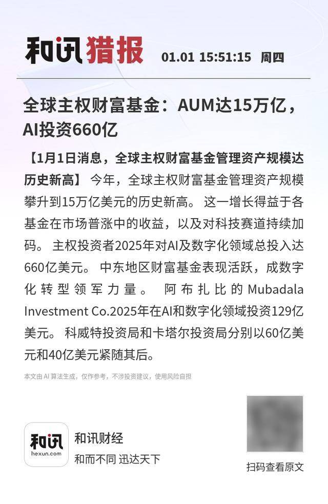 和讯猎报 01.01 15:51:15 周 【1月1日消息,全球主权财富基金管理资产规模达历史新高】今年,全球主权财富基金管理资产规模攀 升到15万亿美元的历史新高。 这一增长得益于各基金在市场普涨中的收益,以及对科技赛道持续加 码。 主权投资者2025年对AI及数字化领域总投入达660亿美元。 中东地区财富基金表现活跃,成数字 化转型领军力量。 阿布扎比的Mubadala Investment Co.2025年在AI和数字化领域投资129亿美元。 科威 特投资局和卡塔尔投资局分别以60亿美元和40亿美元紧随其后。 本文由 AI 算法生成,仅作参考,不涉投资建议,使用风险自担 本文由 Al 算法生成,仅作参考,不涉投资建议,使用风险自担 和讯财经 和而不同 迅达天下 扫码查看原文 全球主权财富基金:AUM达15万亿, AI投资660亿 【1月1日消息,全球主权财富基金管理资产规模达 历史新高】 今年,全球主权财富基金管理资产规模 攀升到15万亿美元的历史新高。这一增长得益于各 基金在市场普涨中的收益,以及对科技赛道持续加 码。主权投资者2025年对AI及数字化领域总投入达 660亿美元。中东地区财富基金表现活 ...