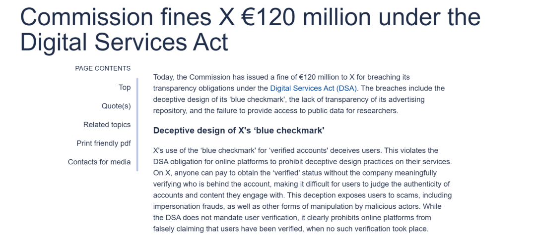 欧盟对美国科技巨头的监管与执法行动 - 今年以来,欧盟依据《数字服务法案》和《数字市场法案》对美国科技企业展开一系列执法行动 [3][6] - 欧盟委员会于2023年12月18日对社交媒体平台X启动《数字服务法案》下的首个正式调查程序,重点审查其在遏制非法内容传播、应对信息操纵等方面所采取措施是否有效 [4] - 美国政府谴责欧盟对社交媒体X公司处以罚款,认为此举特别针对美国公司 [4] 对社交媒体平台X的具体处罚与违规内容 - 欧盟委员会将根据《数字服务法案》作出首份“不合规决定”,对美国社交媒体平台X罚款1.2亿欧元(约合9.9亿元人民币) [3] - 罚款针对三项违规行为:X的“蓝标认证”仅通过付费即可获得,在界面设计上对用户具有误导性,罚款4500万欧元;X的广告资料库在透明度和可访问性方面不合规,罚款3500万欧元;X未按规定向符合条件的研究人员开放平台公共数据访问权限,罚款4000万欧元 [4] - X须在60个工作日内告知欧盟委员会其拟采取哪些具体措施以终止与“蓝标认证”相关的违规行为;须在90个工作日内提交行动计划,列明为纠正涉及广告资料库和研究人员获取公共数据等问题将采取的必要措施 [4] 对其他美国科技巨头的处罚与调查 - 今年4月,欧盟委员会根据《数字市场法案》对苹果和Meta分别处以5亿欧元和2亿欧元罚款,总计7亿欧元 [6] - 今年9月,欧盟委员会对美国科技巨头谷歌处以29.5亿欧元罚款,原因是该公司在广告技术市场中滥用主导地位,损害竞争环境 [6] - 今年12月,欧盟宣布将对Meta启动全面反垄断调查,原因是该公司在WhatsApp中引入的人工智能功能可能损害竞争,欧盟委员会担忧Meta可能会阻止竞争对手通过WhatsApp推出AI服务 [6] 相关方的回应 - 马斯克回应欧盟的罚款决定,称罚款“荒谬”,并表示欧盟应该被废除 [3] - 美国总统特朗普称,如果欧盟继续惩罚美国科技企业,美国将对欧盟加征关税 [4]