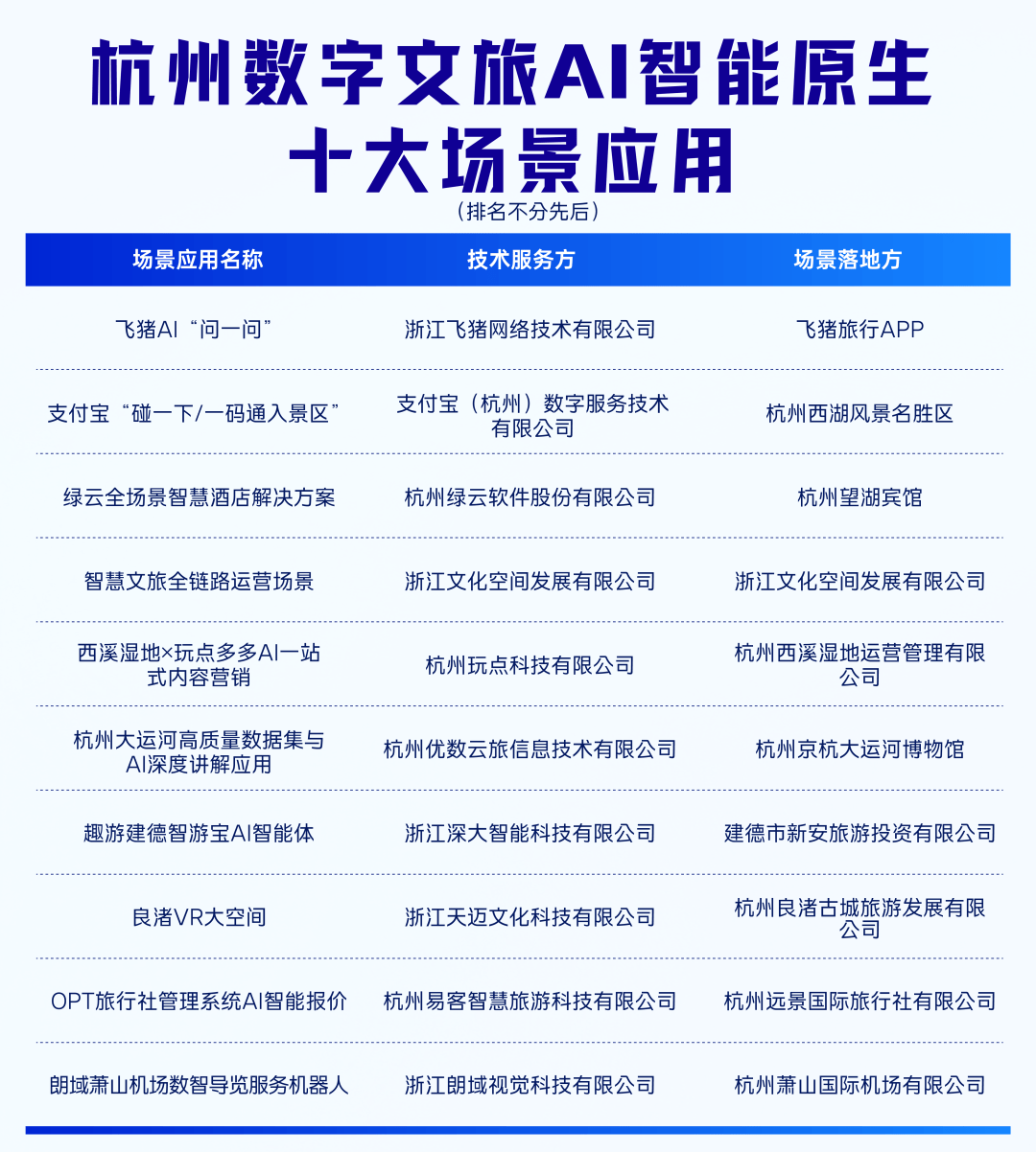 杭州数字文旅AI智能原生十大场景应用 亮相2025杭州数字文旅产业发展大会 快来看看都有哪些吧! | 1 1 - 1 - 1 - 7 - 1 - | | | | --- | --- | --- | | 场景应用名称 | 技术服务方 | 场景落地方 | | 飞猪Al"问一问" | 浙江飞猪网络技术有限公司 | 飞猪旅行APP | | … | | | | 支付宝"碰一下/一码通入景区" | 支付宝(杭州)数字服务技术 有限公司 | 杭州西湖风景名胜区 | | | | | | 绿云全场景智慧酒店解决方案 | 杭州绿云软件股份有限公司 | 杭州望湖宾馆 | | | …… | | | 智慧文旅全链路运营场景 | 浙江文化空间发展有限公司 | 浙江文化空间发展有限公司 | | 西溪湿地×玩点多多Al一站 | 杭州玩点科技有限公司 | 杭州西溪湿地运营管理有限 | | 式内容营销 | | 公司 | | …… | | | | 杭州大运河高质量数据集与 Al深度讲解应用 | 杭州优数云旅信息技术有限公司 | 杭州京杭大运河博物馆 | | 趣游建德智游宝AI智能体 | 浙江深大智能科技有限公司 | 建德市新安旅游投资有限公司 | ...