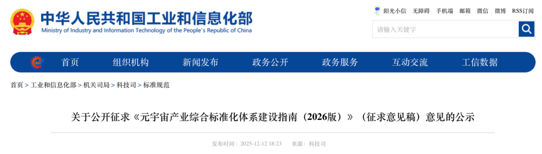 【导读】事关元宇宙产业创新发展,重磅文件来了! 元宇宙产业创新发展的标准体系 元宇宙,是数字与物理世界融通作用的沉浸式互联空间,是新一代信息技术集成创新和应用的未来产业,具有高度沉浸、实时永续、自主创造、开放互联 的特征。 《征求意见稿》中提到,元宇宙作为数字经济与实体经济融合的高级形态,对推动制造业高端化、智能化、绿色化转型升级,完善现代化产业体系具有重 要支撑作用。 根据《征求意见稿》总体要求,到2028年,制定国家标准和行业标准20项以上,初步构建支撑元宇宙产业创新发展的标准体系。 到2030年,制定国家标准和行业标准50项以上,适度超前布局一批支撑未来产业高质量发展需要的关键标准,加快元宇宙国际标准供给,促进元宇宙产业 全球化发展。 元宇宙产业标准体系结构包括基础标准、支撑能力标准、通用服务标准、应用标准、开发运营标准、安全与治理标准等6个部分。 12月12日,工信部公开征求《元宇宙产业综合标准化体系建设指南(2026版)》(征求意见稿)意见(以下简称《征求意见稿》)。 到2028年初步构建支撑 其中,基础标准主要规范元宇宙的概念、架构、分类等,是元宇宙基础性、框架性、总体性的标准;支撑能力标准主要规 ...