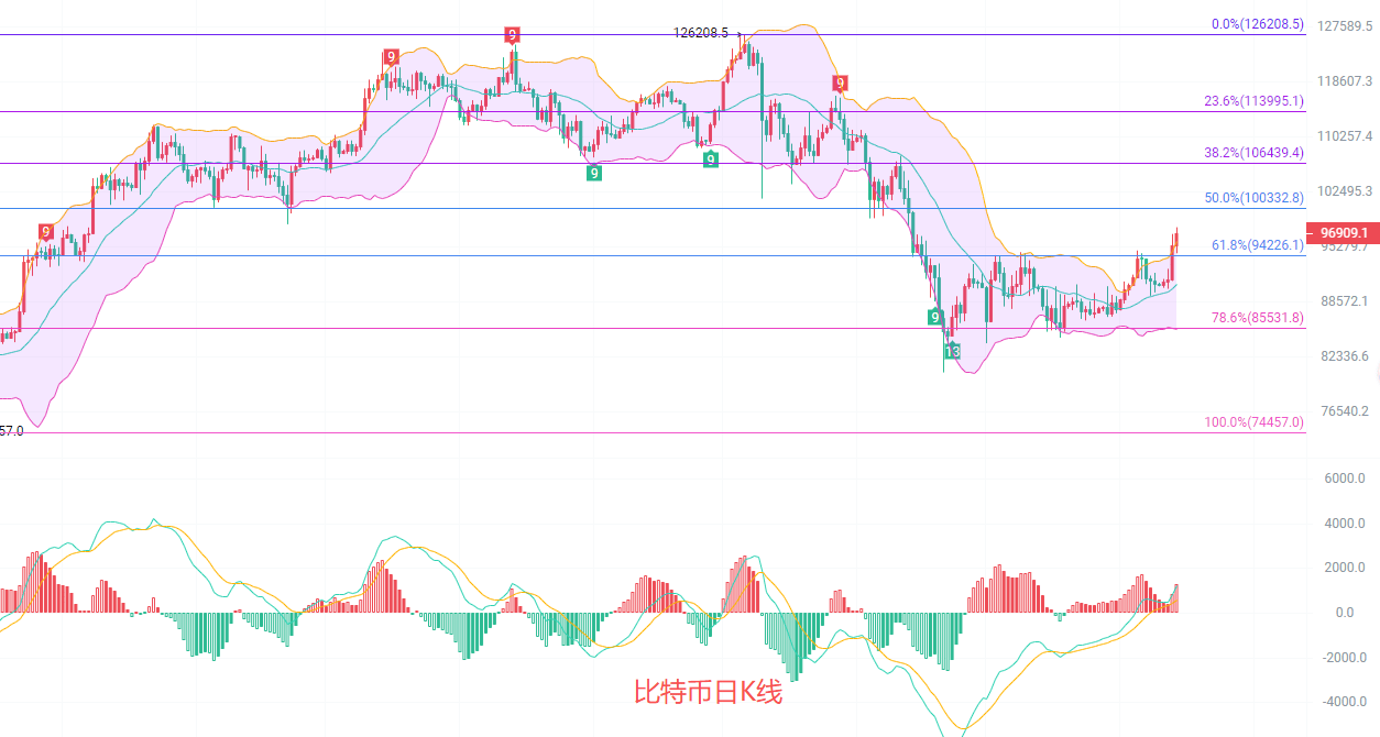 比特币行情分析与交易策略 - 文章核心观点为比特币价格在强势上涨后,短期内存在回调需求,但整体趋势仍以看涨北上为主,并提供了具体的短线操作区间[1][3][5] - 比特币当前价格约为97,000美元,自90,000美元上涨以来,已突破94,000美元关键阻力位,并正在测试冲击100,000美元的可能性[1] - 日线级别技术分析显示,价格从最低94,400美元回踩黄金分割线0.618支撑后发力,最高触及97,750美元,目前已突破EMA120趋势线阻力位97,000美元[3] - 日线级别MACD指标显示连续放量增筹,DIF与DEA线进入多头排列模式,布林带上轨阻力位95,800美元已转变为支撑位[3] - 四小时K线图显示壶嘴形态走强,EMA各趋势线向上开口扩散,EMA15快线支撑预计将推动价格突破94,000美元分割线继续上行[5] - 四小时级别布林带开口扩散,K线围绕上轨97,000美元震荡上行的概率增加,但行情已进入极端超买区域,存在技术性回调需求[5] 具体操作建议 - 短线操作建议在价格不跌破95,000至94,500美元区间时北上做多,止损设置400点,目标看向96,000至97,000美元,若破位则看98,000至99,000美元[5] - 短线操作建议在价格不突破99,000至99,500美元区间时南下做空,止损设置400点,目标看向98,500至98,000美元,若破位则看97,500至97,000美元[5] - 强调所有操作需以实时盘口数据为准,并应严格设置止损止盈,以控制仓位和风险[5]