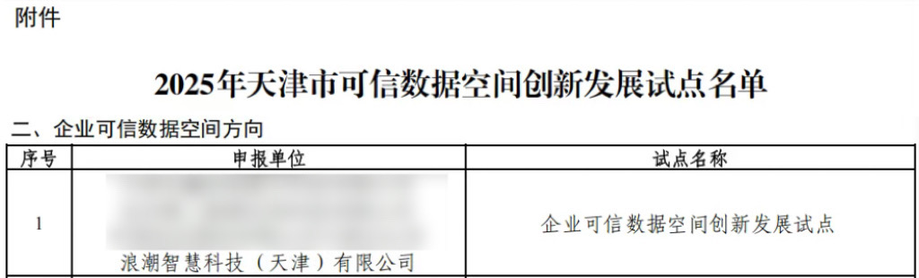 近日,天津市数据局公布"2025年天津市可信数据空间创新发展试点名单"。浪潮智慧科技(天津)有限公司作为联合申报单位之一,成功入选"企 业可信数据空间创新发展试点"。这不仅体现了公司在数据可信流通与要素市场化配置方面的技术实力与实践能力获得权威认可,也为其进一步参 与天津数据要素市场建设奠定了坚实基础。 本次试点工作是天津市深化数据要素市场化改革的重要举措,旨在聚焦可信数据空间在多行业、多企业层面的创新应用场景与可持续运营模式, 打破数据流通壁垒,保障数据安全有序流动,充分释放数据要素核心价值,助力天津数字经济高质量发展。浪潮智慧科技凭借与天津东疆星链数 字科技有限公司等合作方的协同优势,成功获得试点资格,并将共同开展企业级可信数据空间的试点建设。 此次入选是浪潮智慧科技与浪潮云协同发力、共拓数据要素市场的重要里程碑。未来,双方将进一步深化协作,联合各界合作伙伴,深耕企业可 信数据空间的多元应用场景,积极探索数据资产化与资本化的创新路径,为天津市构建健康繁荣、安全可控的数据要素市场生态贡献浪潮力量。 | 序号 | 申报单位 | 试点名称 | | --- | --- | --- | | | | 企业可信数据空间 ...