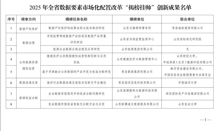 山东公布2025数据要素市场化配置改革“揭榜挂帅”创新成果
