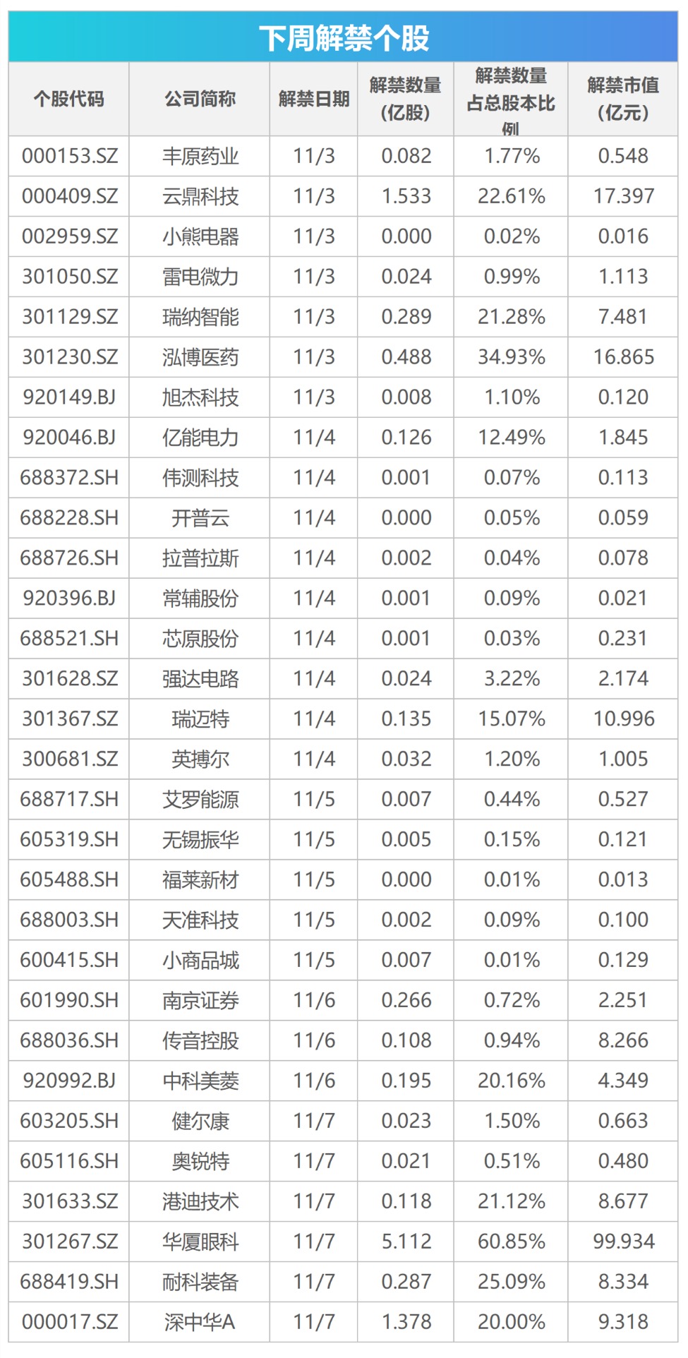 进博会 - 第八届进博会将于11月5日至10日举办,企业展展览面积超过36.7万平方米,参展企业在去年3496家的基础上新增600余家,总数创历史新高[1] - 有290家世界500强和行业龙头企业参展,同期将举办虹桥国际经济论坛,设置33场分论坛及闭门会[1] 国际金融领袖投资峰会 - 国际金融领袖投资峰会将于2025年11月3日至5日在香港举行,为香港金融管理局连续第四年举办[2] - 大约300位国际金融领袖将参与峰会,其中包括超过100位集团主席或行政总裁,主题为“驾驭变局砥砺前行”[2] 世界互联网大会乌镇峰会 - 2025年世界互联网大会乌镇峰会将于11月6日至9日在浙江乌镇举行,主题为“共筑开放合作、安全普惠的数智未来——携手构建网络空间命运共同体”[3] 消费电子创新大会 - CEIC 2025消费电子创新大会将于11月6日至8日在深圳举办,展览规模1.5万平方米,聚焦智能终端、智能汽车、智能家居、数字健康与新技术芯片五大领域[4] - 大会将重点展示基于鸿蒙、星闪、菁彩视听等技术的产品,2000多项创新科技产品将集中亮相[4] 限售股解禁 - 下周限售股上市数量为10.28亿股,市值约为203.22亿元[5] - 华厦眼科解禁市值最大,为99.93亿元,涉及5.11亿股,占总股本比例60.85%[5] - 云鼎科技、泓博医药、瑞迈特、深中华A、港迪技术、耐科装备、瑞纳智能等公司解禁市值均超过7亿元[5] 新股发行 - 下周将有3只新股发行,11月3日发行北矿检测,申购代码920160[8] - 11月7日发行恒坤新材和南网数字,申购代码分别为787727和301638[8]