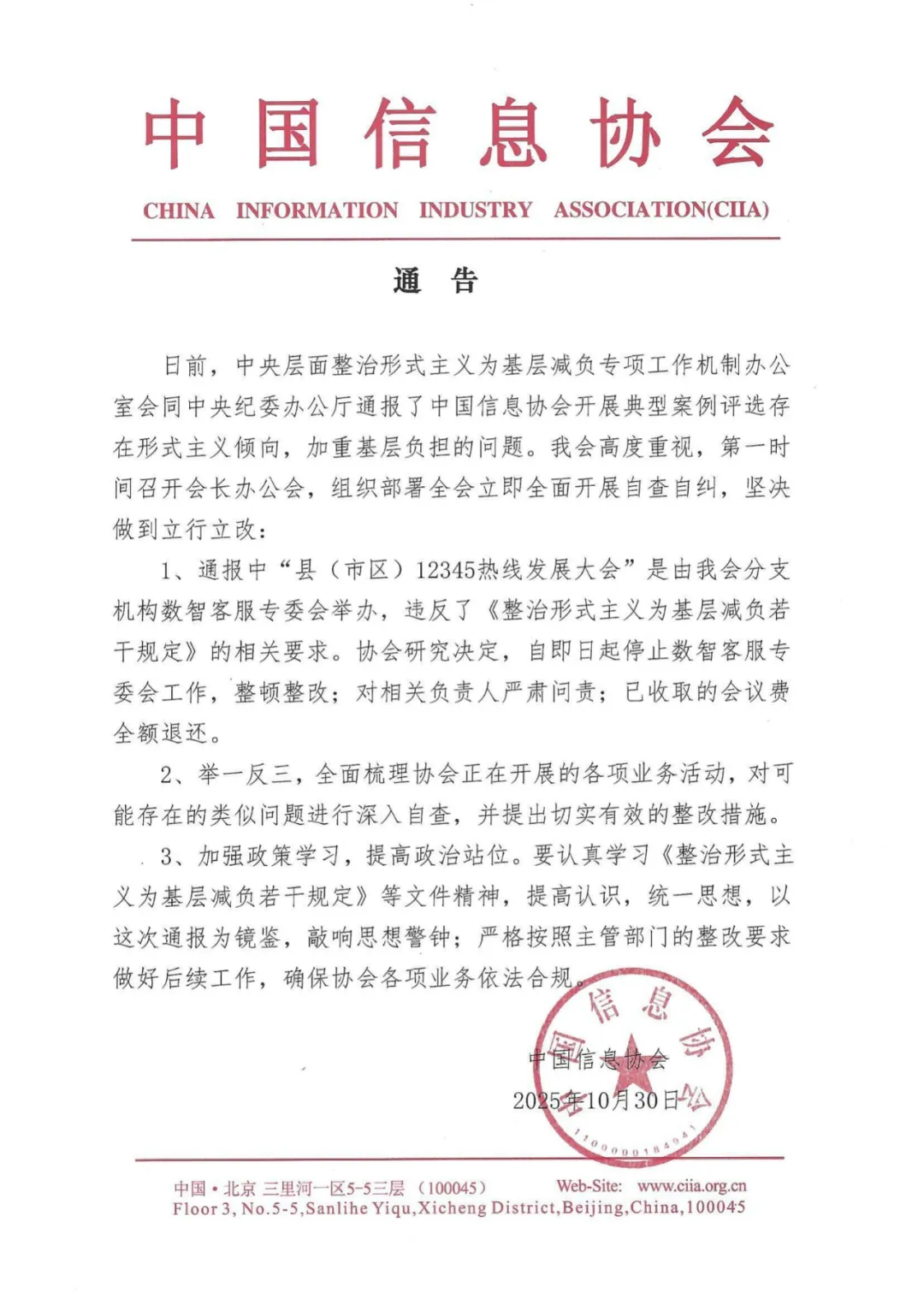 据新华社10月30日消息,日前,中央层面整治形式主义为基层减负专项工作机制办公室会同中央纪委办公厅对2起整治形式主义为基层减负典型问题进行 通报。 其中包括中国信息协会开展典型案例评选存在形式主义倾向,加重基层负担。 管 旗 被通报当天,中国信息协会发布通告。 通告称,中国信息协会高度重视,第一时间召开会长办公会,组织部署全会立即全面开展自查自纠,坚决做到立行立改: 1、通报中"县(市区)12345热线发展大会"是由我会分支机构数智客服专委会举办,违反了《整治形式主义为基层减负若干规定》的相关要求。协会研究决 定,自即日起停止数智客服专委会工作,整顿整改;对相关负责人严肃问责;已收取的会议费全额退还。 2、举一反三,全面梳理协会正在开展的各项业务活动,对可能存在的类似问题进行深入自查,并提出切实有效的整改措施。 日前,中央层面整治形式主义为基层减负专项工作机制办公 室会同中央纪委办公厅通报了中国信息协会开展典型案例评选存 在形式主义倾向,加重基层负担的问题。我会高度重视,第一时 间召开会长办公会,组织部署全会立即全面开展自查自纠,坚决 做到立行立改: 1、通报中"县(市区)12345热线发展大会"是由我会分支 ...