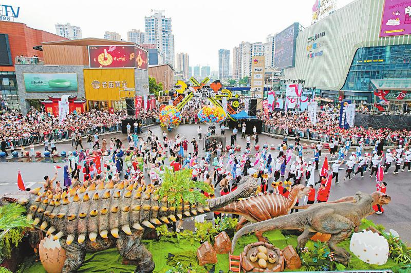 "华夏衣冠"方阵如一幅流动的古画。40人身着汉唐宋明服饰,手持团扇、纸伞缓步前行,或演绎"曲水流 觞",或吟唱《水调歌头》,尽显礼仪之邦的典雅。"舌尖之旅"方阵的"美食铛铛车"烟火气十足,40名厨师随乐挥 舞炒勺,盐帮菜香飘街道,吆喝声热闹。 巡游现场。自贡市委宣传部供图 11时,随着最后一个方阵抵达展示区,《我和我的祖国》的旋律在现场响起。专业歌手立于花车之上领唱, 318名演职人员迅速变换队形,整齐列队齐声合唱。道路两侧的市民纷纷自发加入,合唱声响彻盐都上空,家国情 怀在歌声中凝聚。 "快看,恐龙嘴巴动了!"10月1日10时,自贡市华商南苑街至迎春路的1.2公里街道上,自贡国际恐龙文化旅 游节核心活动——"史前派对 恐龙大巡游"启幕。318名演职人员组成6大主题方阵,以沉浸式表演串联起盐都地质 记忆与传统文化;正午掀起千人大合唱热潮,饱含家国情怀的歌声在街头巷尾飘荡。 为让更多群众感受盐都文化魅力,10月3日自贡将在富顺县新增一场巡游活动。届时将组织恐龙、气模、非 遗、群众等方阵组成巡游队伍,为市民呈现一场可看、可听、可感的大型巡游活动。(记者 丛雨萌) 巡游刚启动,"侏罗纪狂想"方阵点燃现场。13米长的 ...