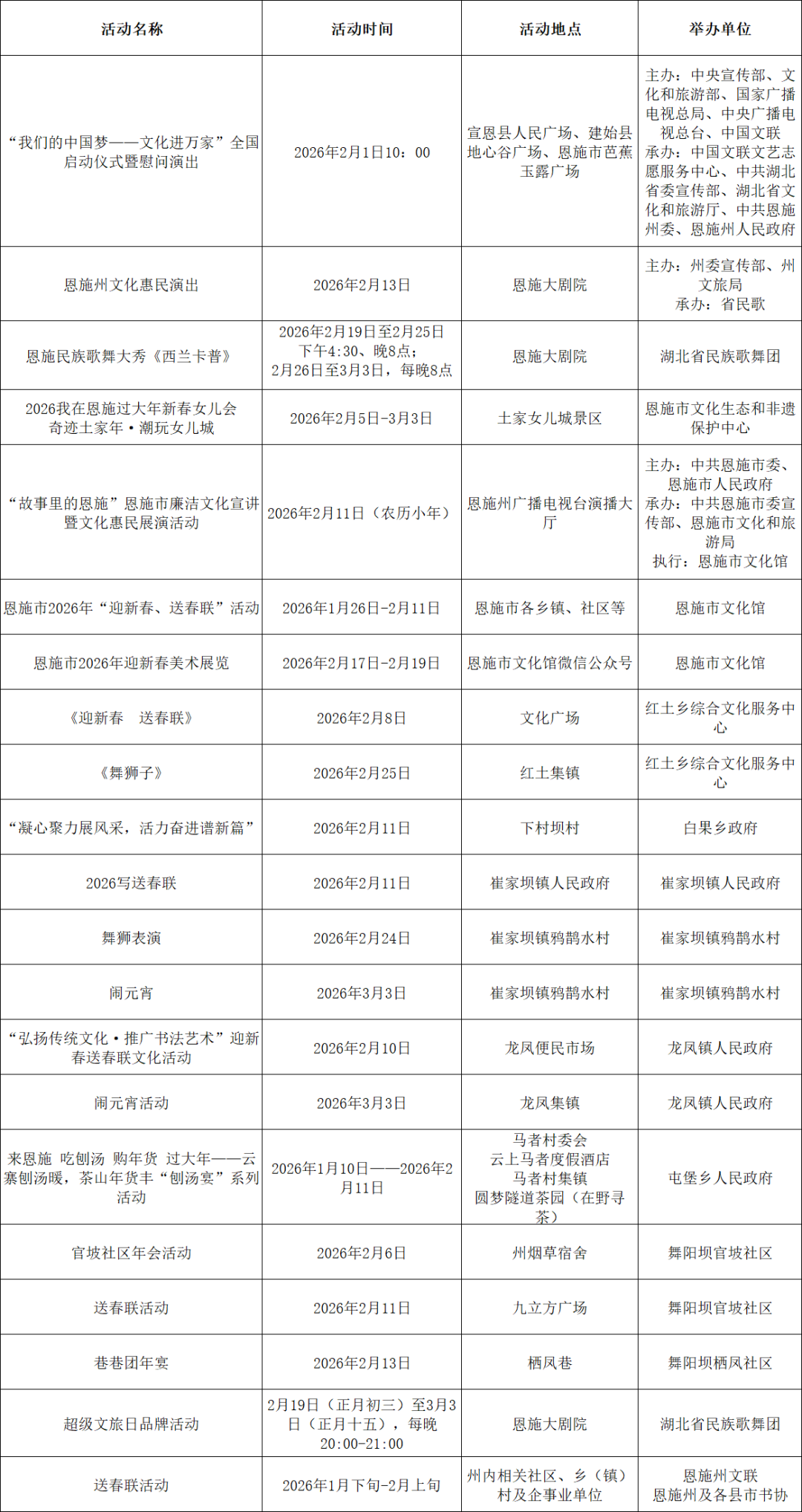文章核心观点 - 恩施州为迎接2026年马年春节,在全州八县市策划并组织了超过百场、形式多样且时间跨度长的系列文化娱乐活动,旨在营造节日氛围、丰富民众文化生活并促进文旅消费 [1][2][8] 活动规模与时间跨度 - 活动总数超过百场,在全州范围内形成“八县市联动,百场活动接力”的格局 [1] - 整体活动时间从2025年12月持续至2026年3月上旬,覆盖整个春节及元宵节周期 [1][3][4][6][7] 活动类型与内容 - **大型文艺演出与启动仪式**:包括国家级项目“我们的中国梦——文化进万家”全国启动仪式暨慰问演出,于2026年2月1日在宣恩县、建始县、恩施市三地同时举行 [1][3][5] - **专业剧场演出**:如恩施民族歌舞大秀《西兰卡普》在恩施大剧院从2月19日持续演出至3月3日 [1] - **民俗节庆与庙会**:各县市普遍举办元宵灯会、舞龙舞狮、非遗巡游、刨汤宴、新春歌会等传统民俗活动 [1][2][3][6][7] - **文化惠民与展览**:广泛开展送春联、美术书法摄影展、图书阅读、电影展播等公益活动,深入社区、乡镇 [1][2][3][4][6][8] - **体育健康活动**:包含迎新健康跑、欢乐跑、趣味运动会等体育过大年系列活动 [4][6][7] - **促消费活动**:结合“吃刨汤、购年货”主题,在多县市开展民俗美食促消费活动 [2][3][6] 主要举办地点 - **核心文化场馆**:恩施大剧院、各县市文化馆、图书馆、广场(如宣恩县人民广场、利川清风明月广场、建始船儿岛文化中心、咸丰皇城广场)是活动主要集中地 [1][2][3][5][6] - **旅游景区**:活动深入腾龙洞、地心谷、土家女儿城、仙佛寺、杨梅古寨等主要景区,实现文旅融合 [1][2][3][7] - **基层社区与乡镇**:活动广泛覆盖各乡镇、街道、社区及乡村,确保群众参与度 [1][2][3][4][6][7] 组织与参与单位 - **高级别主办单位**:部分活动由中央宣传部、文化和旅游部、国家广播电视总局、中央广播电视总台、中国文联等国家级单位主办 [1][3][5] - **地方政府与部门**:州、县(市)各级党委、政府、宣传部、文旅局是绝大多数活动的核心组织者 [1][2][3][4][5][6][7][8] - **专业团体与机构**:湖北省民族歌舞团、各级文联、书协、文化馆、图书馆、景区运营公司等具体承办和执行活动 [1][2][3][6][8] - **基层单位**:乡镇政府、社区居委会、村民委员会等基层组织是活动落地实施的关键力量 [1][2][3][4][6][7]