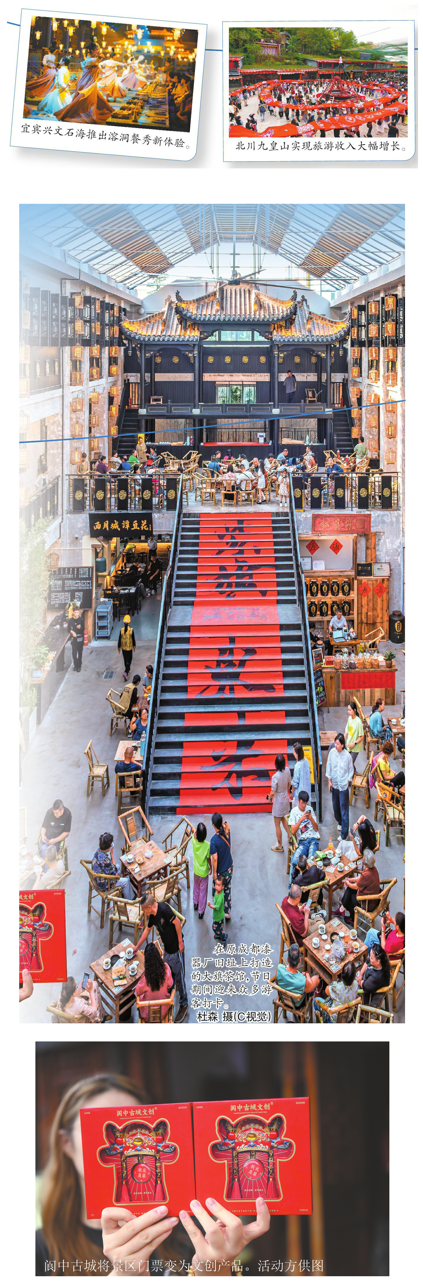宜宾兴文石海推出溶洞餐秀新体验。 北川九皇山实现旅 n = 8 8 t t 201 gg 8 65 Elfaller CHANGE THE 面月城 浮豆花; Links | 湖北 NEWS 2017-04-14 20:00:00 PM 10-2 1 4 文创 (2) 20 记者从文化和旅游厅了解到,经第三方大数据综合测算,10月1日至8日,全省共接待游客4734.15万人次,实现旅游消费总额384.01亿元,按可比口径计 算分别同比增长8.32%和6.53%。三星堆-金沙、九寨沟-黄龙、峨眉山-乐山大佛、青城山-都江堰等世界级文旅地标人气爆棚,连续多日"客满"。 这是省委十二届七次全会部署推进文化和旅游深度融合发展后的首个长假,全省推出6大主题、1300余场文旅消费促进活动,从细枝末节处提升服务品 质、增强游客体验。 这份"文旅+百业""百业+文旅"假日蓬勃图景,彰显四川正加快把文旅资源优势转化为高质量发展优势,突出高能级主体培育和高品质产品供给,努力走 出一条具有中国特色、彰显巴蜀魅力的文化和旅游深度融合发展新路子。 美景引客来 到锦绣天府,游安逸四川。国庆中秋假期,全省文旅市场供需两旺、量质齐升,吸引八方 ...