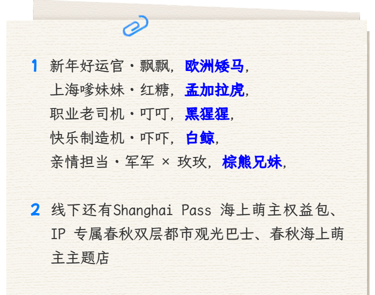 上海文旅推出全新IP“海上萌主” - 上海市文化旅游局于2026年新春前夕发布全新文旅IP“海上萌主”,该IP以上海多家景区的高人气城市动物明星为灵感,旨在通过轻盈、亲和的表达方式连接城市文脉、节日情绪与当代审美,并作为新春问候向市民游客传递[1] IP核心构成:五位(组)动物明星 - “海上萌主”IP由五位(组)来自上海不同动物园与海洋世界的动物组成,它们因真实、生动、富有个性的日常状态而受到游客和网友喜爱,形成了鲜明的公众形象[4] - **新年好运官 飘飘**:为上海野生动物园的14岁欧洲矮马,以其温顺开朗的性格和能完成点头、抬脚等互动动作而受欢迎,代表平安、顺利的祝愿[4][6][8] - **上海嗲妹妹 红糖**:为上海动物园1岁半的孟加拉虎,以其圆眼、蓬松脑袋和爱亲近游客的“嗲”态颠覆猛兽刻板印象[8][10][12][14] - **职业老司机 叮叮**:为上海野生动物园3岁的黑猩猩,以其骑小车、玩转盘和与游客对视互动展现聪明与高运动细胞[14][16][18][19] - **快乐制造机 吓吓**:为上海海昌海洋公园25岁的白鲸,以其做鬼脸、张大嘴(被创意解读为“谢谢侬”)等互动带来欢乐,并巧妙融入上海方言文化[19][22][25] - **亲情担当 军军&玫玫**:为上海动物园的棕熊兄妹,哥哥军军2岁调皮爱玩轮胎,妹妹玫玫1岁软萌好奇,共同演绎“陪伴”主题[25][28][29][31] 创意内容与传播 - 围绕IP推出1分钟拜年短片,采用实拍结合AI技术,将动物真实形象与上海外滩、东方明珠、豫园、博物馆、江河交汇处等城市地标融合呈现,在熟悉的城市画面中传递节日祝福[31] 线下体验与商业拓展 - IP发布同步推出多场景线下体验,包括“Shanghai Pass海上萌主权益包”、IP专属春秋双层都市观光巴士以及春秋海上萌主主题店,通过联动让萌主形象融入城市日常,丰富新春出行体验[31][32][34] IP战略意义与城市形象 - “海上萌主”以温和、亲切的方式提升了城市的情绪价值,其传递的陪伴、快乐与祝福与上海开放、包容、富有活力的城市气质相呼应,旨在以“可爱”作为城市的一种表达方式,用萌力点亮城市[34]
