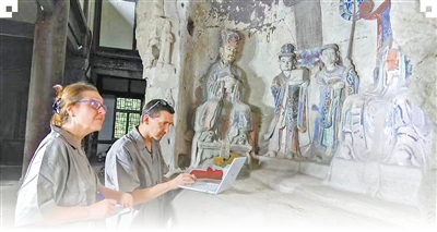 卡洛(右)与米莱拉在大足石刻开展造像病害诊断分析工 作。 大足石刻研究院供图 萨马德(左)参加巴基斯坦开普省考古与博物馆管理局举 办的犍陀罗艺术研讨会。 图为受访者提供 当地学生在巴基斯坦开普省马尔丹市的塔赫特巴希佛寺遗 址参观。 艾哈迈德·卡迈勒摄(新华社发) 历史文化遗产不仅述说着过去,也深刻影响着当下和未来。从大足石刻的修复合作到敦煌学的全球学术 交流,再到巴基斯坦犍陀罗艺术的保护与传播,中外学者共同守护人类历史文化遗产,促进文明交流互 鉴和不同国家、民族相互了解,为构建人类命运共同体注入深厚的人文力量。 中意专家合作保护大足石刻—— "为全世界文物保护修复工作提供样本" 高奕睿(左三)与学生在大英图书馆研究敦煌文献。 图为受访者提供 作。舒成岩摩崖造像雕凿于南宋绍兴十三年至二十三年间,是集雕刻、彩绘、贴金于一体的道教造像。 卡洛到来时,看到造像存在石质风化,彩绘起甲、脱落,贴金层开裂、起翘等问题。 卡洛及其团队曾参与意大利威尼托大区内威尼斯、维罗纳古城等世界文化遗产的保护工作,经验丰富。 在大足区,卡洛与米莱拉每天都穿着印有"大足石刻文物保护"字样的棕色文保工作服,与大足石刻保护 工程中心的技术人员一 ...