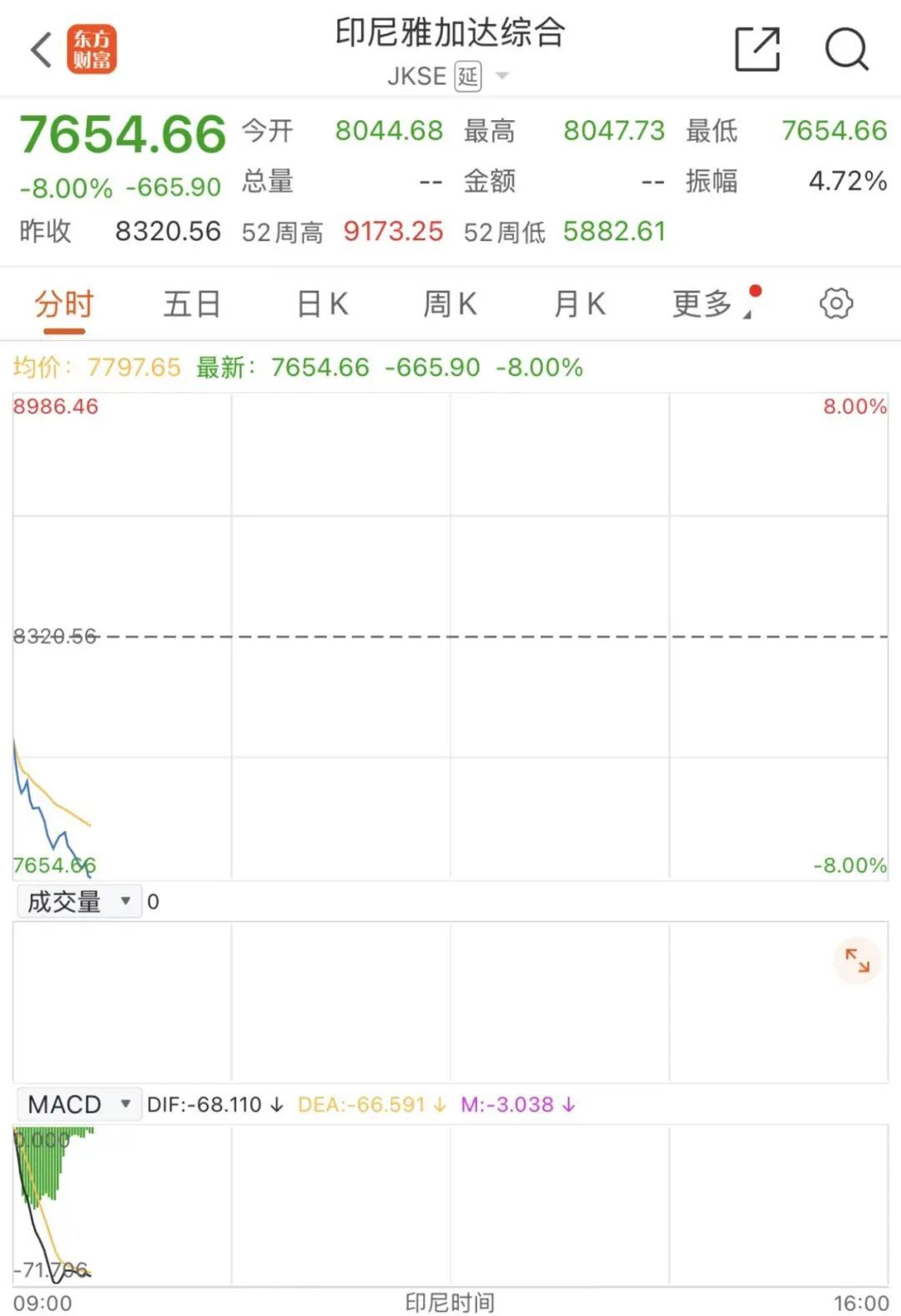 印尼股市再度触发熔断。 1月29日,印尼股市开盘后延续昨日暴跌走势,印尼雅加达综合指数跌幅迅速扩大至8%,触发市场暂停交易。 此次抛售潮源于明晟公司(MSCI)发出的一条措辞严厉的警告,引发外资对印尼股票投资价值的新一轮质疑。 当地时间1月29日09:26:01,印尼证券交易所交易系统实施了临时交易暂停措施。交易将于印尼中部标准时间09:56:01恢复,交易时间表不变。 恢复交易后,印尼股市继续下跌势头。截至发稿,印尼雅加达综合指数跌幅扩大至9.64%。 MSCI表示,鉴于市场对印尼股票自由流通股数量和整体市场准入的持续担忧,将暂时冻结印尼股票指数调整,并警告若5月前无改善,可能将其从新兴市 场指数降级。 MSCI在声明中指出,印尼市场长期面临流通股比例过低、少数股东控制大量股份以及流动性不足等结构性问题。该公司被警告,若5月前未能在市场透明 度和监管方面取得显著进展,可能将其从新兴市场指数降级。 印尼交易所上市部门主管I Gede Nyoman Yetna在周三表示,交易所承诺响应MSCI对提升市场透明度的要求,并将与该公司协作以寻求共识。交易所还计 划就合理的流通股比例水平征询市场参与者意见,并将与KSE ...