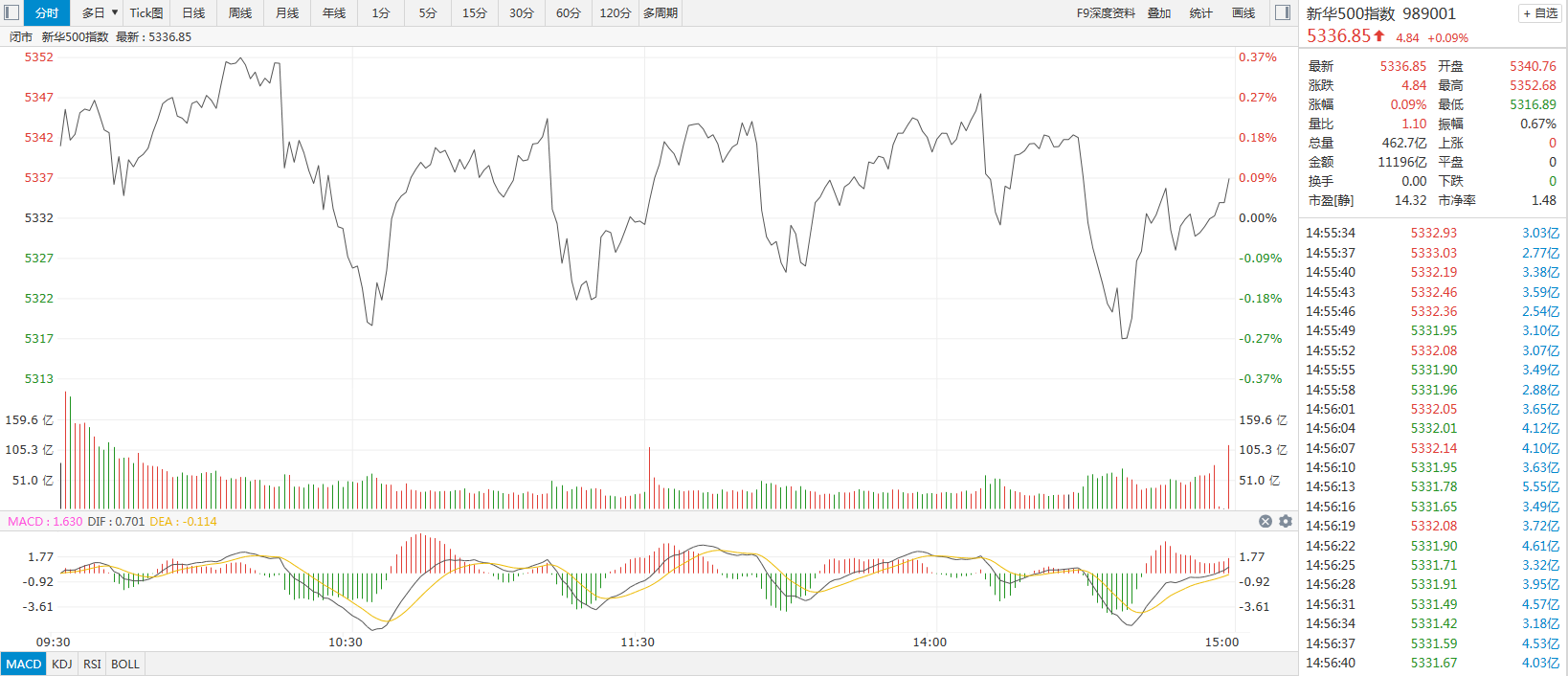 新华财经北京1月23日电 新华500指数(989001)1月23日收盘上涨4.84点,涨幅0.09%,报5336.85点。 (文章来源:新华财经) 成分股方面,美畅股份、迈为股份、捷佳伟创、晶科能源收于约20%涨停,晶盛机电、容百科技、天合光能、蓝思科技、禾迈股份、先导智能涨逾10%,益 丰药房、明阳智能、隆基绿能、中国卫星、金风科技、爱旭股份、四维图新、福斯特、铜陵有色收于约10%涨停;深南电路、华峰化学、中国长城、中际旭 创、沪电股份等跌幅靠前。 新华500指数本周(2025年1月19日至1月23日)累计上涨0.41%。 走势上看,新华500指数(989001)23日早间小幅高开,指数盘初震荡上扬,早盘期间最高涨0.39%,此后呈宽幅整理态势,收盘时微幅上涨。 指数盘中最高触及5352.68点,最低触及5316.89点,成分股全天总成交额报11196亿元,总成交额较上一交易日小幅放量。 ...