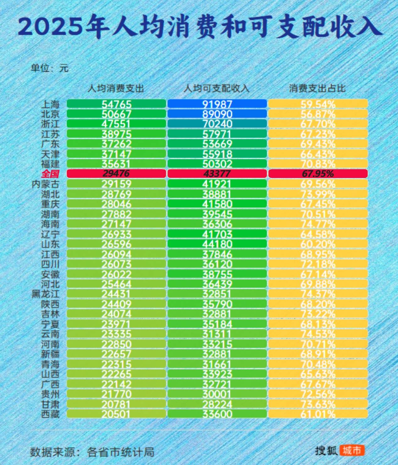 全国居民人均消费与收入核心数据 - 2025年全国居民人均消费支出为29476元,人均可支配收入为43377元 [1] - 全国居民人均可支配收入中位数为36231元,增长4.4%,是平均数的83.5% [5] - 城镇居民人均可支配收入中位数为51115元,农村居民为20711元 [5] 人均消费支出领先地区 - 有7个省份人均消费支出超过全国平均水平,排名前十的地区依次为上海、北京、浙江、江苏、广东、天津、福建、内蒙古、湖北、重庆 [2] - 第一梯队(消费水平最高):上海人均消费支出54765元(较2024年增长2043元),北京50667元(增长919元),浙江47551元(增长2444元) [3] - 第二梯队(3万至4万元):包括江苏(38975元)、广东(37262元)、天津(37147元)、福建(35631元)四个沿海省市 [3] - 第三梯队(2万至3万元):包括内蒙古、湖北、重庆、山西等24个地区,构成全国消费市场基本盘 [3] 人均可支配收入领先地区 - 有8个地区人均可支配收入跑赢全国水平,其中7地超过5万元 [4] - 上海居民人均可支配收入突破9万元大关,达到91987元(2024年为88366元),位居全国第一 [4] - 北京以89090元位居第二,浙江以70240元位居第三并突破7万元大关 [4] - 甘肃以28224元的人均可支配收入暂列全国末位,是唯一低于3万元的省份 [5] 收入来源构成 - 2025年全国居民人均工资性收入24555元,增长5.3%,占人均可支配收入的56.6% [5] - 人均经营净收入7252元,增长5.0%,占比16.7% [5] - 人均财产净收入3490元,增长1.6%,占比8.0% [5] - 人均转移净收入8080元,增长5.7%,占比18.6% [5] 消费支出结构 - 居民消费主要花在食品烟酒、居住、交通通信、教育文化娱乐、医疗保健五大方面 [7] - 食品烟酒和居住两项支出占据超一半花费 [7] - 2025年全国居民人均食品烟酒消费支出8631元,增长2.6%,占人均消费支出的29.3% [9] - 人均居住消费支出6397元,增长2.1%,占人均消费支出的21.7% [9] - 人均衣着消费支出1554元,增长2.2%,占人均消费支出的5.3% [9] 消费市场新趋势 - 2025年社会消费品零售总额首次突破50万亿元,达到501202亿元,比上年增长3.7% [11] - 服务性消费支出占居民人均消费支出的比重为46.1%,显示消费正从商品为主向商品与服务并重发展 [11] - 线上消费增长较快,网上零售额比上年增长8.6%,直播交易额、即时零售交易额均实现两位数增长 [11] - 绿色消费日益普及,汽车以旧换新中新能源汽车占比近60%,家电换新中一级能效(水效)产品占比超90% [11] - 网络问诊、在线培训、首发经济、冰雪经济、银发经济等新型服务与消费模式不断拓展增长新空间 [11] 地区消费特征与差异 - 北京“消费支出占比”(消费占收入比)为56.87%,为全国最低 [1][3] - 京沪等大城市居民面临房贷、房租开支压力,但2025年12月商品住宅销售价格环比下降、同比降幅扩大,叠加房贷利率下调,压力有所减轻 [9] - 顶尖公司和高集聚、人才吸引是京沪居民平均收入偏高的重要原因,浙江作为共同富裕示范区也吸引了大量就业者 [5]