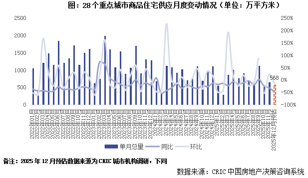 文章核心观点 - 2025年12月,28个重点城市新房供应量在低位持稳,环比下降12%,同比大幅下跌49%,全年累计供应同比下降19%,供给约束显著 [1] - 供应结构持续向改善型需求倾斜,重点城市刚需、改善、高端产品占比分别为26%、56%和18%,且近8成城市以主城区为供应主力 [1][4][7] - 尽管供应量低,但得益于供应结构“提质缩量”及房企年末促销,预期12月新房成交将迎来一波脉冲式复苏,环比回升显著,但同比降幅可能因高基数而扩大 [1][10] 01规模:12月28城供应约束依旧,一线持平上月、二线回调显著 - **总体供应**:12月28城预计新增商品住宅供应面积568万平方米,环比下降12%,同比下跌49%,2025年全年累计供应面积同比下降19% [1] - **一线城市**:4个一线城市12月预计供应147万平方米,环比微降1%,全年累计供应同比下降15% [2] - 北京单月供应同环比倍增,年末集中推盘 [2] - 上海供应进入“空窗期”,单月仅5万平方米,推盘节奏大幅放缓 [2] - 广州、深圳供应环比分别下降4%和26% [2] - **二线城市**:19个二线城市12月预计供应385万平方米,环比下降20%,全年累计同比下降19% [2] - 城市分化加剧:宁波、长春短期放量显著,环比增幅均超120%;武汉、长沙、合肥环比增幅超60%,属低位补货 [2] - 多数城市供应低迷:西安、成都、济南、福州等同环比降幅显著,均在6成以上 [2] - **三四线城市**:5个三四线城市12月预估供应35万平方米,环比大幅增长82%(主因前期基数过低),全年累计同比下降22% [2] 02结构:近8成城市以主城为供应主力,沪蓉津汉等18城改善占比主导 - **产品档次结构**:重点城市供应结构以改善型为主,刚需、改善、高端占比分别为26%、56%和18% [1][4] - 宁波、南京等城市刚需产品供应占比约6成 [4] - 郑州、广州、长沙、北京刚需与改善占比不分伯仲,均在4-5成 [4] - 上海、成都、天津、武汉等18城以改善产品为供应主力 [4] - 深圳、杭州、福州、无锡等城市本月高端产品占比在各档次中居首 [4] - **项目区域结构**:重点城市主城、近郊、远郊供应占比分别为66%、24%和10%,供应重心集中在主城区 [7] - 泉州、福州、郑州、南宁、西安、昆明、重庆等城市主城供应占比均在9成以上 [7] - 长春、济南、长沙、宁波等城市以近郊项目为主,占比均在5成及以上 [7] - 青岛、苏州本月主城区与近郊推盘占比相同 [7] - 上海、天津、南京本月以远郊项目为供给主力 [7] 03预判:12月多数城市新房成交预期“翘尾”收官,环比回升显著 - **总体预判**:12月供应“提质缩量”叠加房企年末优惠折扣,预期将带动新房成交迎来一轮脉冲式翘尾行情,环比回升显著,但同比降幅可能持续扩大 [1][10] - **市场热度**:28个重点城市2025年12月预期项目平均去化率约30% [10] - **城市分化预判**: - 上海、成都等前期热点城市成交预期低位持稳,供应缩量制约成交,部分热点板块项目销售出现滑坡迹象 [10] - 天津、武汉、南京、合肥等城市延续弱复苏走势,购房信心逐步修复 [10] - 郑州、福州、厦门等弱二线城市,预期新房成交回升幅度有限 [10] - **具体城市成交环比预期**(新房):北京(+26%)、广州(+17%)、杭州(+30%)、天津(+22%)、武汉(大幅上升)、重庆(+30%)、济南(+20%)、青岛(+10%)、南京(+20%)、长沙(+20%)等城市预期环比增长;上海预计仍处低位;深圳为弱修复;成都为短暂脉冲 [11]