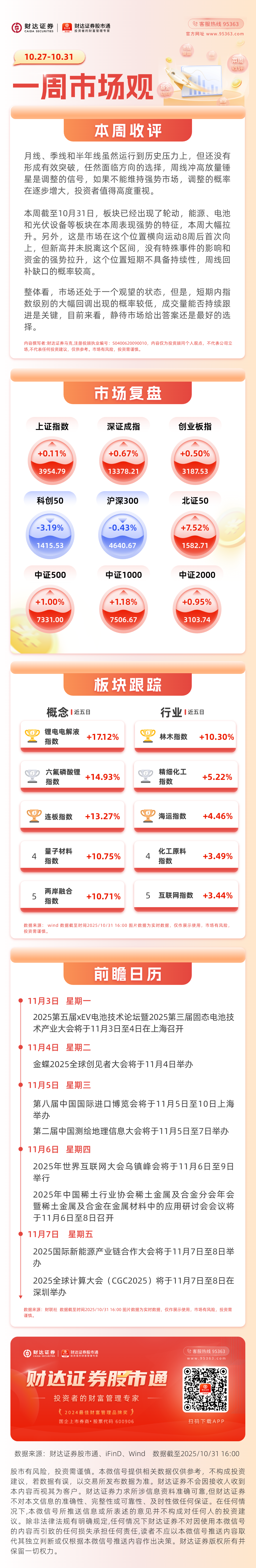 市场指数表现 - 上证指数上涨0.50%,收于3954.79点 [3] - 深证成指上涨0.67%,收于13378.21点 [3] - 创业板指上涨0.11%,收于3187.53点 [3] - 科创50指数下跌3.19%,收于1415.53点 [3] - 沪深300指数大幅上涨7.52%,收于1582.71点 [3] - 中证500指数上涨0.95%,收于7506.67点 [3] - 中证1000指数上涨1.00%,收于7331.00点 [3] - 中证2000指数上涨1.18%,收于3103.74点 [3] - 北证50指数下跌0.43%,收于4640.67点 [3] 行业板块表现 - 週电电解液指数近五日涨幅达17.12% [3] - 精细化工指数近五日上涨14.93% [4] - 海运指数近五日上涨13.27% [4] - 量子材料指数近五日上涨10.75% [4] - 六氟磷酸锂指数近五日上涨10.30% [3][4] - 两岸融合指数近五日上涨10.71% [4] - 连板指数近五日上涨4.46% [4] - 互联网指数近五日上涨3.44% [4] - 化工原料指数近五日上涨3.49% [4] - 林木指数近五日上涨5.22% [3][4] 前瞻性行业会议 - 2025第五届xEV电池技术论坛暨第三届固态电池技术产业大会将于11月3日至4日在上海召开 [7] - 金蝶2025全球创见者大会将于11月4日举办 [7] - 第八届中国国际进口博览会将于11月5日至10日在上海举办 [7] - 第二届中国测绘地理信息大会将于11月5日至7日举办 [8] - 2025年世界互联网大会乌镇峰会将于11月6日至9日举行 [8] - 2025年中国稀土行业协会稀土金属及合金分会年会将于11月6日至8日召开 [8] - 2025国际新能源产业链合作大会将于11月7日至8日举办 [8] - 2025全球计算大会(CGC2025)将于11月7日至8日在深圳举办 [8]