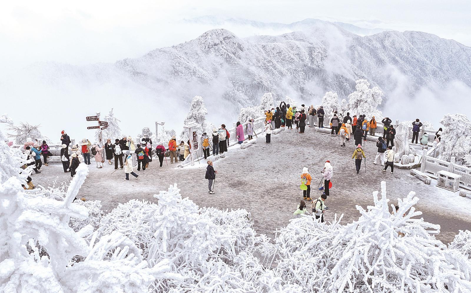 (来源:中国旅游报) 受气温和降雪影响,近日,湖南省衡阳市南岳衡山风景区出现冰雪雾凇景观,玉树琼枝的雾凇晶莹剔透,银装素裹的山林在云海里若隐若现,吸引众多游客 前来赏雪游玩。图为1月22日游客在衡山赏雾凇美景。视觉中国 供图 转自:中国旅游报 ...