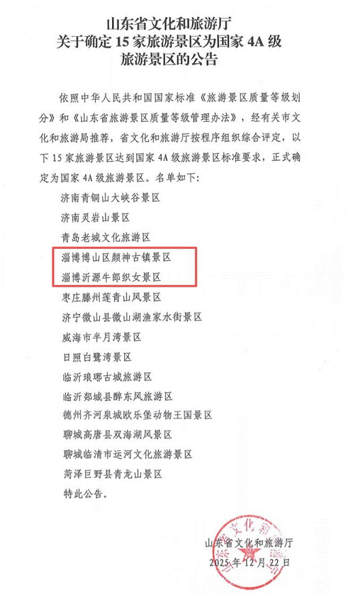 齐鲁晚报.齐鲁壹点张晓光 12月22日,山东省文化和旅游厅发布了关于确定15家旅游景区为国家4A级旅游景区的公告。其中,淄博新增2家国 家4A级旅游景区,分别是博山区颜神古镇景区和沂源牛郎织女景区。 颜神古镇景区位于淄博市博山区山头街道,是一处以古窑集群为特色、陶瓷琉璃非遗为主题的传统街区。这里保存 着13座古圆窑、连片的明清古建筑群及上世纪50至80年代的旧厂区,历史层叠,风貌独具。 古镇内度假酒店、精品民宿、琉璃剧场、陶艺体验中心、艺术家工作室、博物馆等多元设施齐备,融观光游览、研 学教育、商务会展、创意文化于一体,是服务与设施一流、参与性和体验性俱佳的旅游度假目的地。探古窑、品美 食、体验非遗,在千年窑火的光影中,开启一场兼具文艺与烟火的跨年之旅。 沂源牛郎织女景区位于淄博市沂源县燕崖镇,占地5300亩,森林覆盖率92%,是国家水利风景区、省级风景名胜 区。这里拥有淄博最大侧柏古树群,以及叶籽银杏、一线天等独特景观。 织女洞为省级文保单位,沂源"牛郎织女传说"为国家级非遗。唐代织女洞与明代牛郎庙隔沂河相望,形成"天上银 河,地上沂河"的奇观,是国内唯一与传说实景对应的文化遗存,被专家誉为"中国爱情文化源 ...