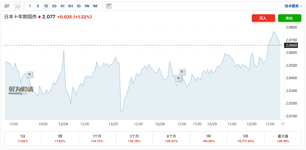 由于对日本政府财政状况的担忧,基准十年期日本国债收益率周二上升逾2个基点,至2.077%,距离12月22日触及的2.1%水平不远,该水平是自1999 年2月以来的最高水平。数据显示,该收益率在2025年已累计飙升近1个百分点,创下自1994年以来的最大年度涨幅。 由于日本央行削减购债、通胀持续高企、以及日本政府推行大规模财政刺激计划,日本国债在2025年经历了剧烈波动。自11月初以来,出于对日本首 相高市早苗推出的财政刺激计划将损及日本财政可持续性的担忧,日本长期国债收益率大幅攀升,接连创下历史新高。 12月16日,日本国会批准了2025财年(2025年4月至2026年3月)补充预算案,财政支出规模高达18.3万亿日元,号称疫情后最大规模。这一预算案以应 对物价上涨、促进经济增长为名,其中的11.7万亿日元将通过新发行国债来筹措。上周五,日本政府在阁僚会议上敲定了2026财年预算,一般会计预 算总额约为122.3092万亿日元。这一规模超过2025财年的约115万亿日元,刷新历史最高纪录。 全球金融市场面临的挑战是,日本国债与美国国债利差的收窄可能导致以日元为基础的套利交易的平仓,并促使资金回流至日本,导致其 ...