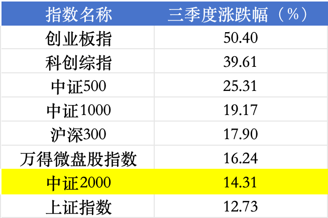 10月27日,三大股指高开,沪指涨近1%逼近4000点。中证2000增强ETF(159552)飘红,连续三日"揽 金"6600万。近期资金悄然布局小盘,什么信号? 浙商证券分析指出,中小盘在11月跑赢万得全A的胜率全年居前,仅次于2月、5月、8月。随着三季报 落地,中小盘的上涨概率相较于10月将显著提升。 从近期表现来看,截至10月17日,中证2000增强ETF(159552)近一年收益达62.67%,同类33只产品中 排名第一(来源:银河证券基金研究中心)。 回顾三季度,中证2000指数涨幅14.31%,对比其他宽基指数,表现较为平淡。 基金经理邓童在基金三季报中分析,本季度市场风格差异明显,成长风格表现远好于价值风格,但成长 风格拉升的同时小盘风格并未维持强势,大盘风格出现了明显的反弹,大盘成长板块出现了快速上涨。 | 指数名称 | 三季度涨跌幅(%) | | --- | --- | | 创业板指 | 50.40 | | 科创综指 | 39.61 | | 中证500 | 25.31 | | 中证1000 | 19.17 | | 沪深300 | 17.90 | | 万得微盘股指数 | 16.24 | | 中 ...