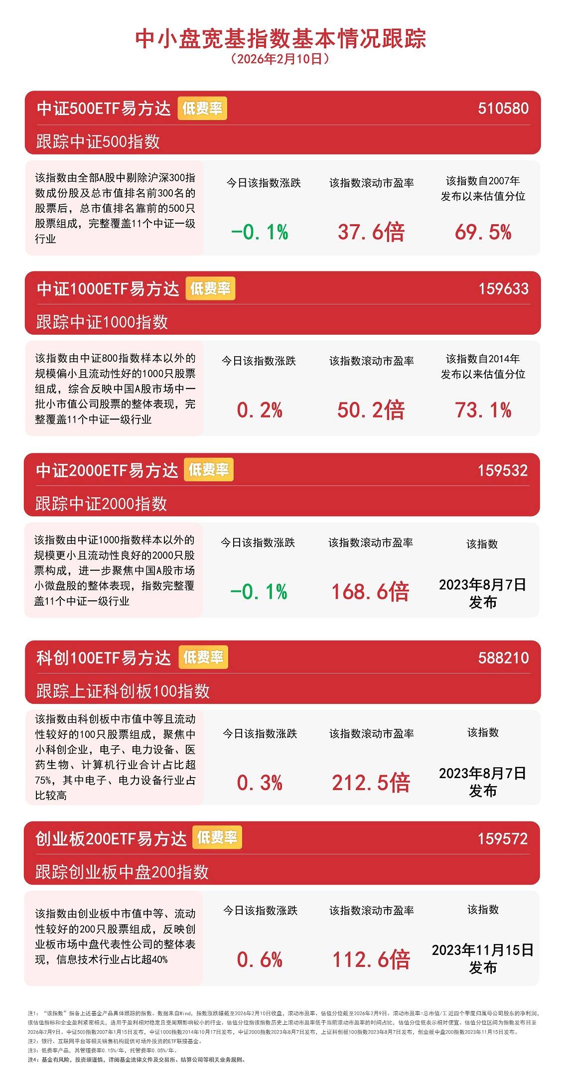 中小盘宽基指数涨跌不一,关注中证2000ETF易方达(159532)、中证500ETF易方达(510580)后续表现