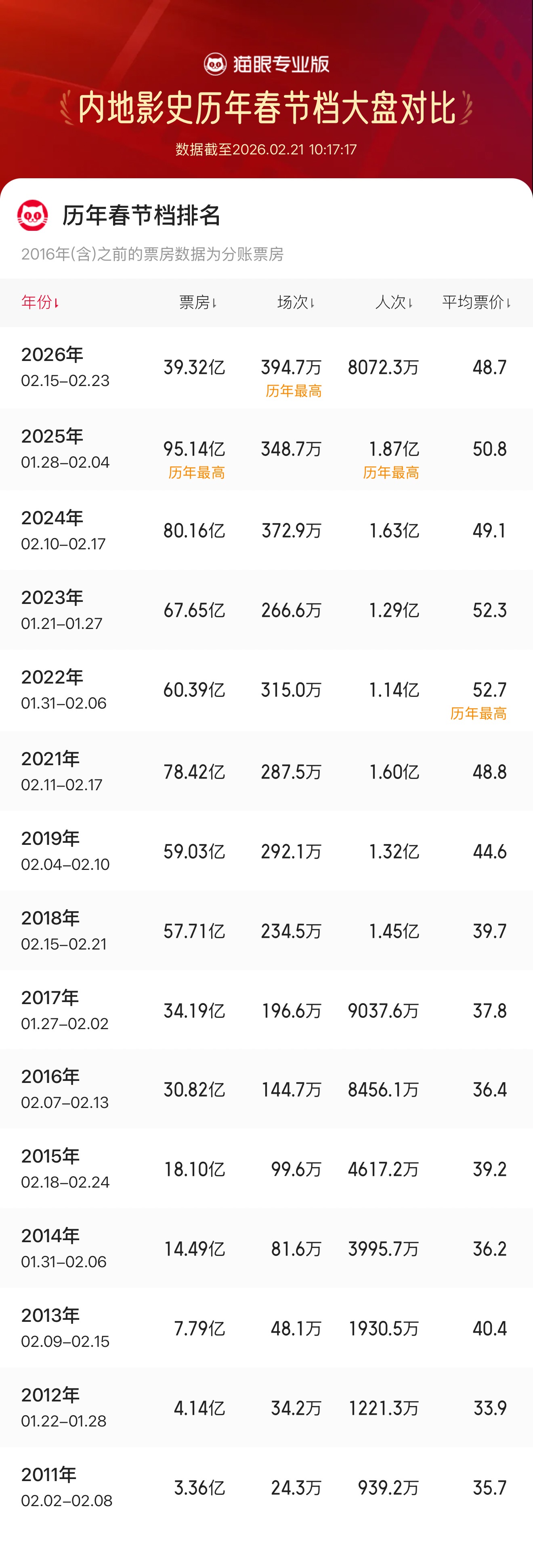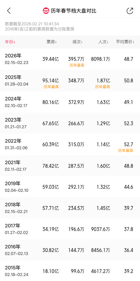 2026年春节档核心数据 - 截至2026年2月21日10:41:34,2026年春节档(2月15日至2月23日)总票房已达39.44亿元[1][3] - 2026年春节档总场次超过395.7万场,刷新中国影史春节档总场次纪录[1][3] - 2026年春节档观影人次为8098.1万,平均票价为48.7元[2][4] 历年春节档数据对比(票房) - 2025年春节档(1月28日至2月4日)总票房为95.14亿元,为历年最高纪录[2][4] - 2024年春节档(2月10日至2月17日)总票房为80.16亿元[2][4] - 2023年春节档(1月21日至1月27日)总票房为67.65亿元[2][4] - 2022年春节档(1月31日至2月6日)总票房为60.39亿元[2][4] - 2021年春节档(2月11日至2月17日)总票房为78.42亿元[2][4] - 2019年春节档(2月4日至2月10日)总票房为59.03亿元[2][4] - 2018年春节档(2月15日至2月21日)总票房为57.71亿元[4][5] - 2017年春节档(1月27日至2月2日)总票房为34.19亿元[2][5] - 2016年春节档(2月7日至2月13日)总票房为30.82亿元[3][5] - 2015年春节档(2月18日至2月24日)总票房为18.10亿元[3][5] 历年春节档数据对比(场次) - 2026年春节档场次395.7万场,为历年最高[2][4] - 2025年春节档场次为348.7万场[2][4] - 2024年春节档场次为372.9万场[2][4] - 2023年春节档场次为266.6万场[2][4] - 2022年春节档场次为315.0万场[2][4] - 2021年春节档场次为287.5万场[2][4] - 2019年春节档场次为292.1万场[2][4] - 2018年春节档场次为234.5万场[4][5] - 2017年春节档场次为196.6万场[2][5] - 2016年春节档场次为144.7万场[3][5] - 2015年春节档场次为99.6万场[3][5] 历年春节档数据对比(观影人次) - 2025年春节档观影人次为1.87亿,为历年最高[2][4] - 2024年春节档观影人次为1.63亿[2][4] - 2023年春节档观影人次为1.29亿[2][4] - 2022年春节档观影人次为1.14亿[2][4] - 2021年春节档观影人次为1.60亿[2][4] - 2019年春节档观影人次为1.32亿[2][4] - 2018年春节档观影人次为1.45亿[4][5] - 2017年春节档观影人次为9037.6万[2][5] - 2016年春节档观影人次为8456.1万[3][5] - 2015年春节档观影人次为4617.2万[3][5] 历年春节档数据对比(平均票价) - 2022年春节档平均票价为52.7元,为历年最高[2][4] - 2023年春节档平均票价为52.3元[2][4] - 2025年春节档平均票价为50.8元[2][4] - 2024年春节档平均票价为49.1元[2][4] - 2026年春节档平均票价为48.7元[2][4] - 2021年春节档平均票价为48.8元[2][4] - 2019年春节档平均票价为44.6元[2][4] - 2018年春节档平均票价为39.7元[4][5] - 2015年春节档平均票价为39.2元[3][5] - 2017年春节档平均票价为37.8元[2][5] - 2016年春节档平均票价为36.4元[3][5]