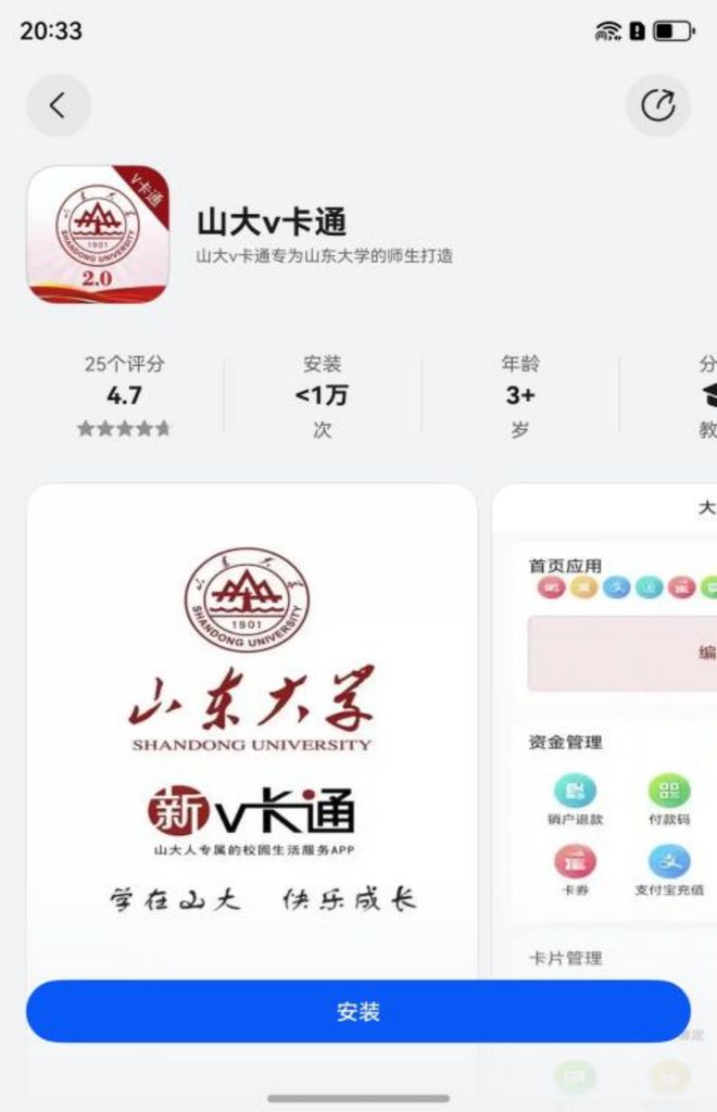 "终于有NFC校园卡了,自己的学校必须给个好评!""NFC终于上了!" 在华为应用商店的评论区,山东 大学师生们的真实留言,为鸿蒙版"山大v卡通"的进化写下了最生动的注脚。自今年9月正式上线以来, 鸿蒙版"山大v卡通" 便踏上了以师生需求为核心的快速迭代之路。此次上线备受期待的NFC功能,并深 度融合服务卡片、统一扫码、多重安全保护等鸿蒙核心特性,不仅为山东大学师生带来更稳定、更智慧 的校园应用服务体验,更完成了一次基于鸿蒙系统级能力的深度重构。这标志着山东大学的校园数字化 服务,从"满足需求"的1.0阶段,迈入了"主动进化、体验引领"的2.0时代。" | 20:33 > | | | (3 | | --- | --- | --- | --- | | 山大v卡通 | | | | | 山大v卡通专为山东大学的师生打造 | | | | | 2.0 | | | | | 25个评分 安装 | | 年龄 | સ્ત્રે | | 4.7 | <1万 | 3+ | eA | | ★★★★★ 次 | | ਜੋ | 教 | | | | | 大 | | | | 首页应用 | | | | | | 编 | | SHANDONG UN ...