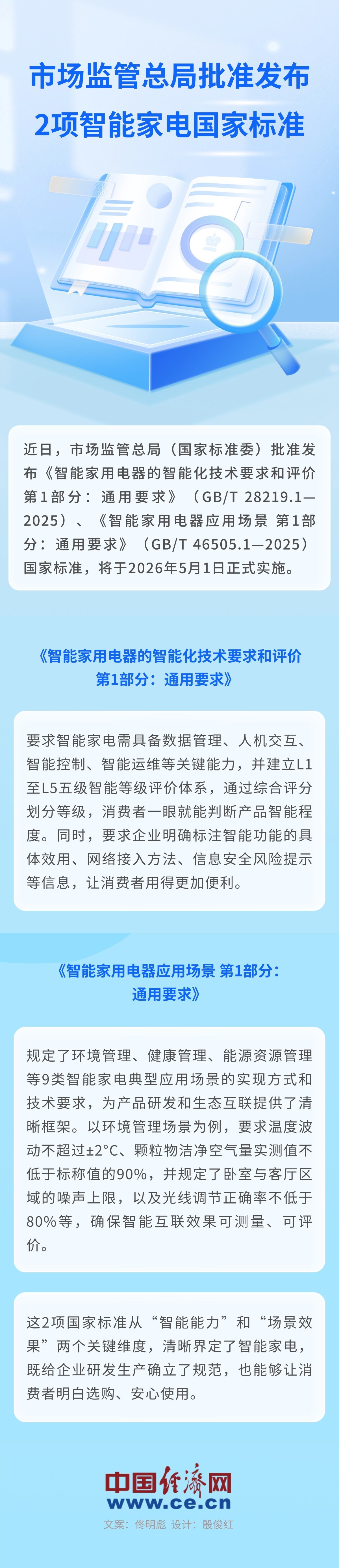 《智能家用电器应用场景第1部分:通用要求》国家标准,规定了环境管理、健康管理、能源资源管理 等9类智能家电典型应用场景的实现方式和技术要求,为产品研发和生态互联提供了清晰框架。以环境 管理场景为例,要求温度波动不超过±2℃、颗粒物洁净空气量实测值不低于标称值的90%,并规定了卧 室与客厅区域的噪声上限,以及光线调节正确率不低于80%等,确保智能互联效果可测量、可评价。 (文章来源:央视新闻) 记者今天了解到,市场监管总局批准发布《智能家用电器的智能化技术要求和评价第1部分:通用要 求》《智能家用电器应用场景第1部分:通用要求》等国家标准,将于2026年5月1日正式实施。这2项国 家标准从"智能能力"和"场景效果"两个关键维度,清晰界定了智能家电的技术要求,既给企业研发生产 确立了规范,也能够让消费者明白选购、安心使用。 《智能家用电器的智能化技术要求和评价第1部分:通用要求》国家标准,要求智能家电须具备数据管 理、人机交互、智能控制、智能运维等关键能力,并建立L1至L5五级智能等级评价体系,通过综合评 分划分等级,消费者一眼就能判断产品智能程度。同时,要求企业明确标注智能功能的具体效用、网络 接入方法、信息安 ...