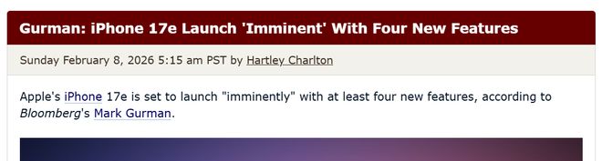 产品发布与规划 - 苹果即将发布新款低成本iPhone 17e,该机型将至少包含四项新功能 [1] - 新款iPhone 17e将搭载去年随iPhone 17首次推出的A19芯片 [3] - 新机将弥补当前一代iPhone的明显不足,增加MagSafe磁吸连接功能 [3] - 该设备将配备苹果最新的蜂窝调制解调器C1X芯片 [3] 定价与市场策略 - iPhone 17e的起售价将与iPhone 16e相同,均为599美元 [3] - 公司计划以相同的价格提供更多功能 [3] - 苹果计划大力向新兴市场用户和企业推广iPhone 17e [3] - 公司可能受益于谷歌和三星等竞争对手在新兴市场领域的竞争减弱 [3]