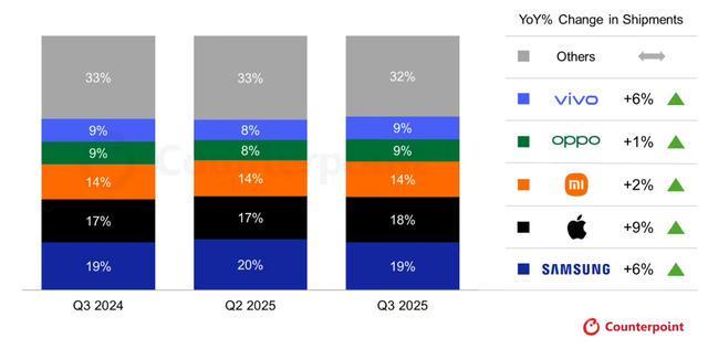 CounterPoint报告:2025年第三季度全球智能手机出货量同比增4%