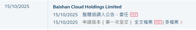 来源:边缘计算社区 2025年10月15日,白山云控股有限公司再次向港交所递交主板上市申请。对于这家成立近十年的独立边 缘云服务商而言,这不仅是一次资本市场的再出发,更是其在全球云计算格局重塑之际迈出的重要一 步。 | | 15/10/2025 整體協調人公告 - 委任 歴 | | --- | --- | | 15/10/2025 | Baishan Cloud Holdings Limited 15/10/2025 申請版本(第一次呈交) 全文檔案 [四] 多檔案 > | 自2019年首次冲击科创板以来,白山云的上市之路几经波折,却始终没有停下前进的脚步。无论是早期 在科创板的探索,还是2023年底赴港递表的尝试,每一次努力都在积累经验、夯实基础,为如今的再次 出发铺垫坚实底色。 这一次,白山云带着更加清晰的战略方向、更成熟的技术体系以及稳步增长的全球业务版图,选择在 AI与边缘计算加速融合的关键时点重新出发。 在行业新一轮变革的浪潮中,白山云不只是追赶者,更希望成为推动边缘计算与智能算力融合的引领 者。尽管仍面临亏损与成本压力等现实挑战,但其持续投入研发、优化业务结构、深化国际布局的努 力,正逐步显现出坚 ...