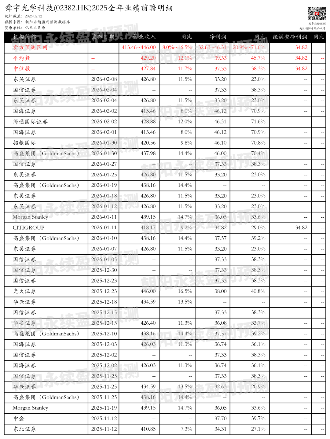 舜宇光学科技全年业绩预期 - 截至2026年2月12日,根据朝阳永续数据,公司预测2025年营业收入为413.46亿元至446.00亿元,同比增长8.0%至16.5% [1][5] - 同期预测净利润为32.63亿元至46.31亿元,同比增长20.9%至71.6% [1][5] - 预测经调整净利润为34.82亿元 [1][5] - 机构预测平均值显示,营业收入平均值为429.20亿元,同比增长12.1%;净利润平均值为39.33亿元,同比增长45.7% [2][7] - 机构预测中位数显示,营业收入中位数为427.84亿元,同比增长11.7%;净利润中位数为37.33亿元,同比增长38.3% [2][7] - 多家机构近期给出具体预测,例如海通国际证券预测净利润为46.31亿元,同比增长71.6%;国海证券预测净利润为46.12亿元,同比增长70.9% [2][7] 最新卖方核心观点 - 海通国际证券认为,公司2025年归母净利润预计将显著增长至45.89-47.24亿元,同比增长70%-75%,远超市场预期 [3][8] - 增长主要得益于股权转让带来的投资收益,以及智能手机摄像头规格高端化推动的产品组合改善 [3][8] - 尽管存储价格上涨对智能手机行业有负面影响,但公司通过旗舰和中高端手机摄像头规格升级维持了增长 [3][8] - 在汽车领域,智能驾驶趋势带动了车载业务增长 [3][8] - 在XR及泛IoT业务中,AI/AR眼镜成为新的增长点 [3][8] - 国海证券同样预测2025年净利润为45.89-47.24亿元,同比增长70-75%,其中包含约9.19亿元的投资收益 [4][10] - 净利润增长主要驱动力是手机产品组合改善和股权转让收益 [4][10] - 尽管手机镜头和摄像头模组出货量有所下滑,但产品平均售价(ASP)增长和毛利率提升显著 [4][10] - 汽车等其他业务产品出货量保持稳健增长 [4][10] 分业务增长驱动力 - **智能手机业务**:公司持续受益于旗舰和中高端智能手机摄像头规格升级,包括可变光圈、潜望式摄像头等技术 [4][9] - 规格升级推动了6P及以上手机镜头、玻塑混合镜头、大像面模组及潜望式模组等高附加值产品的发展 [4][9] - **车载业务**:随着智能驾驶趋势深化,公司车载镜头及模组业务在国内外市场不断拓展 [4][10] - 激光雷达定点项目落地,有望推动该业务实现高速增长 [4][10] - **AI/AR眼镜业务**:公司智能眼镜成像模组全球市场份额领先 [4][10] - 预计2026至2027年,AI/AR眼镜的强劲增长将成为公司业务成长的重要驱动力 [4][10] 未来财务预测 - 国海证券给出了公司2025年至2027年的收入预测,分别为413.46亿元、448.60亿元和483.56亿元 [4][10] - 同期净利润预测分别为46.12亿元、39.50亿元和46.94亿元 [4][10] - 高盛集团在2026年1月30日的预测中,给出营业收入437.98亿元(同比增长14.4%),净利润46.00亿元(同比增长70.4%) [2][7] - Morgan Stanley在2026年1月11日的预测中,给出营业收入439.15亿元(同比增长14.7%),净利润36.05亿元(同比增长33.6%) [2][7]