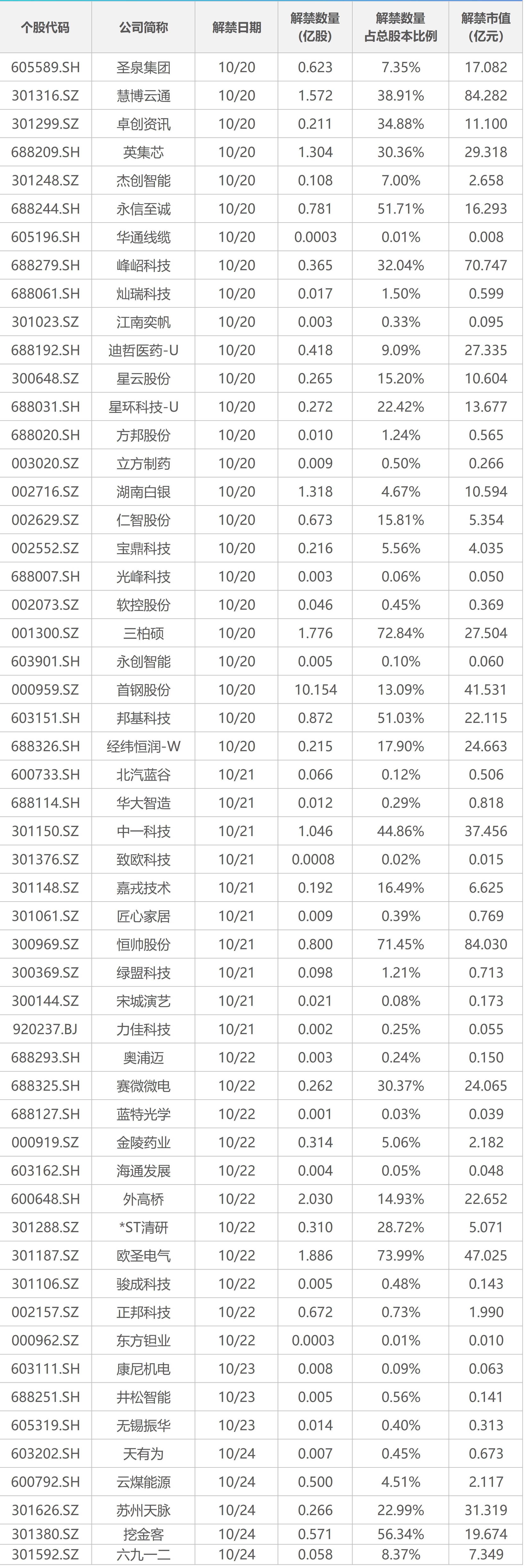 中美经贸关系 - 中美经贸中方牵头人何立峰与美国财政部长贝森特、贸易代表格里尔举行视频通话,双方同意尽快举行新一轮中美经贸磋商 [2] 中国科技与航天 - 力箭一号遥八运载火箭发射成功,将巴基斯坦遥感卫星02星、中科卫星03星和04星共3颗卫星送入预定轨道 [7] - 中国生成式人工智能用户规模达5.15亿人,较2024年12月增长2.66亿人,用户规模半年翻番,普及率为36.5% [9] - "中国天眼"首次捕获恒星黑子区射电暴信号,相关成果在国际学术期刊《科学进展》发表 [8] 金融市场与公司动态 - 本周共有54家公司限售股解禁,合计解禁约30亿股,按最新收盘价计算,合计解禁市值约725亿元 [25] - 解禁市值居前三位的是慧博云通(84.28亿元)、恒帅股份(84.03亿元)、峰岹科技(70.75亿元) [25] - 解禁股数居前三位的是首钢股份(10.15亿股)、外高桥(2.03亿股)、欧圣电气(1.89亿股) [25] - 本周将有1只新股大明电子发行,所属上交所主板,申购代码为603376 [32] - 10月份以来一批中小银行密集下调或准备下调存款利率,业内预计四季度可能有一次10个基点的降息落地 [34] - 苹果公司CEO库克透露Apple Intelligence正在努力进入中国市场 [24] - 广州农商行回应要求员工退还三年过节费,称是进一步规范津贴福利发放 [24] 公司转型与市值 - 千里科技在引入旷视科技创始人印奇后一年内,在智驾、"AI+车"等概念加持下市值涨了近2倍 [35]