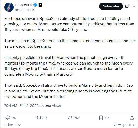 马斯克:暂时搁置火星计划,重点转向建造月球城市