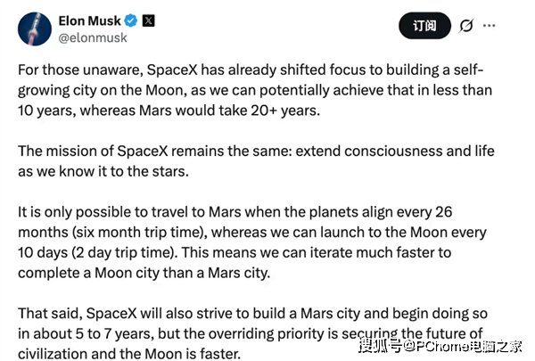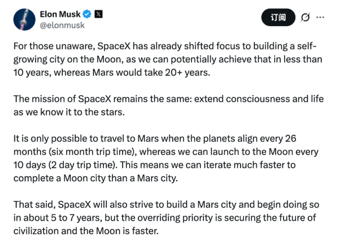 公司战略重心转移 - SpaceX首席执行官宣布公司太空探索重心已转移至在月球建造自我发展的城市[1] - 月球城市目标有望在10年内实现[1] - 火星移民计划预计需要20年以上 相关筹备工作将在5至7年内启动[1] 战略调整的技术与效率考量 - 前往火星的发射时机受限于每26个月一次的行星连珠 航程需6个月[2] - 月球距离更近 登月发射周期可缩短至每10天一次 航程仅需2天[2] - 更短的周期和航程使工程验证、物资补给与人员往返更加现实[2] 公司当前项目进展 - SpaceX正参与NASA阿尔忒弥斯登月计划 并优先聚焦月球任务[4] - 公司目标是在2027年3月进行一次无人登月[4] - 目前正在进行相关飞船的测试[4]