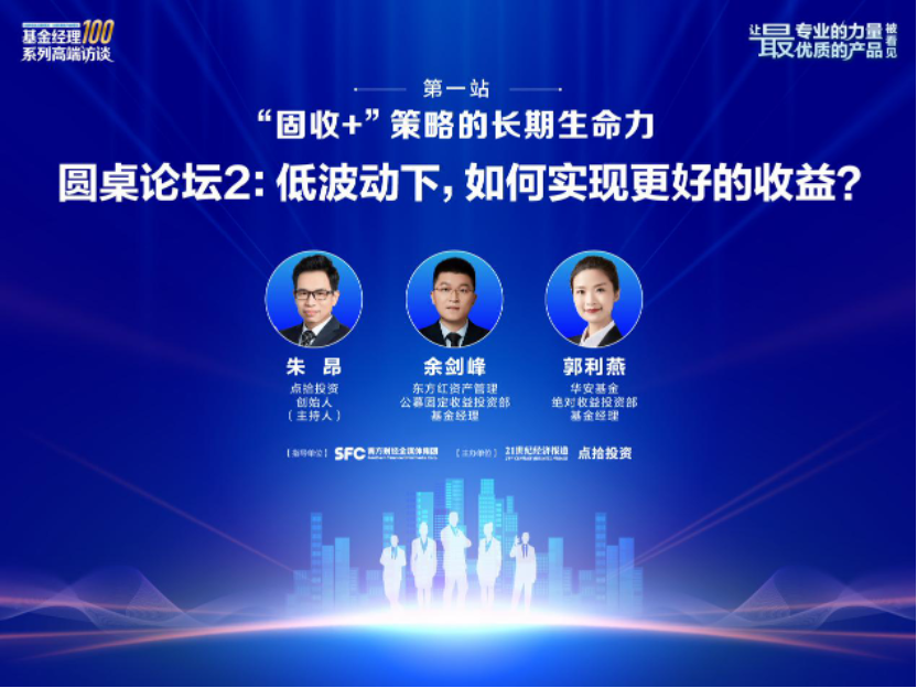 由南方财经全媒体集团指导,21世纪经济报道与点拾投资联合主办的"长期投资·价值投资——基金经理100系列高端访 谈"首场活动,于10月22日在上海正式启动。 21世纪经济报道记者杨娜娜 上海报道 首场活动以"'固收+'策略的长期生命力"为题,来自多家头部公募基金的"固收+"策略负责人、基金经理齐聚一堂,共 同探讨低波时代下该类产品的定位与未来发展路径。 在当前低利率与市场波动并存的背景下,传统银行理财收益率持续下行,投资者普遍面临"收益荒"的困境。而风险偏 好较低的投资者,既希望获得超越传统理财的收益,又对产品波动极为敏感。 在此背景下,"固收+"策略产品因其股债搭配、追求绝对收益的特性,受到市场广泛关注。为此,在本场活动的圆桌二 环节,东方红资产管理公募固定收益投资部基金经理余剑峰与华安基金绝对收益投资部基金经理郭利燕,围绕"低波动 下,如何实现更好的收益"这一核心议题展开了一场深度对话。活动由点拾投资创始人朱昂主持。 余剑峰博士拥有深厚的学术背景,其投资框架基于严谨的资产定价理论,擅长运用目标波动率与最大回撤控制模型进 行组合管理。郭利燕则从可转债研究起步,逐步拓展至股票与转债双轨投资,注重个券风险收益比 ...