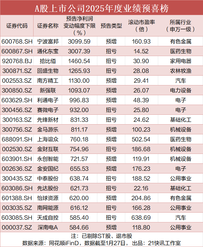 从行业方面看,部分高景气赛道亦有强业绩支撑,来自电子行业的共有31家,占比居首。此外,来自医 药生物的有29家、机械设备的有27家、电力设备的有24家、基础化工的有23家。 公开资料显示,宁波富邦主要从事有色金属材料的加工及销售业务,业务板块涵盖电接触产品生产、铝 型材加工及铝铸棒等产品的贸易业务,具备年产30亿粒电触点及5亿粒电接触元件的产能,产品广泛应 用于家用电器、工业控制、汽车、光伏、5G等领域。 同样受有色金属涨价影响,预计2025年度业绩大幅增长的还有怡球资源(601388.SH)。该公司1月27日盘 后发布业绩预告称,预计2025年年度实现归属于母公司所有者的净利润13354.95万元到19854.95万元, 同比增加620%到970%。由于美国关税原因导致美国当地原料供给的增加,降低了美国公司的原料成 本,同时还给铝锭业务增加了更多的原料选择机会,另外美元降息导致全球大宗商品价格高涨,导致公 司产品销售价格上涨,最终导致公司业绩同比大幅上涨。 整体看,A股已发布业绩预告的公司中,2025年度净利同比预增超100%有253家,其中有123家扭亏、 130家预增。 1月28日,21快讯记者注意到, ...