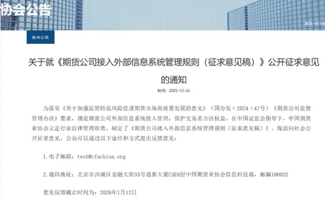 12月26日,中国期货业协会(下称"中期协")发布通知,就《期货公司接入外部信息系统管理规则 (征求意见稿)》(下称《管理规则》)公开征求意见。 中期协表示,为落实《关于加强监管防范风险促进期货市场高质量发展的意见》(国办发﹝2024﹞ 47号)《期货公司监督管理办法》要求,规范期货公司外部信息系统接入管理,保护交易者合法权益, 在中国证监会指导下,中国期货业协会立足行业自律管理职责,制定了《管理规则》。意见反馈截止时 间为2026年1月12日。 | 静食公告 | | | --- | --- | | 关于就《期货公司接入外部信息系统管理规则(征求意见稿)》公开征求意见 | | | 的通知 | | | 时间:2025-12-26 | | | 为落实《关于加强监管防范风险促进期货市场高质量发展的意见》(国办发(2024)47号)《期货公司监督 | 管理办法》要求,规范期报公司外部信息系统接入管理,保护交易者合法权益,在中国证临会指导下,中国阴货 | | 业协会立足行业自律管理职费,向定了《朋货公司接入外部信息系统管理规则(征求意见稿)》,现面向社会公 | 开征求意见。公众可以通过以下途径和方式提出反馈意见: | ...