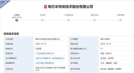 【大河财立方 记者 陈玉尧】继大普微电子"首单"之后,又一家未盈利企业通过创业板第三套上市标 准,申请A股上市。 12月19日,粤芯半导体技术股份有限公司(以下简称"粤芯半导体")的创业板IPO申请获深交所受理。 粤芯半导体目前拥有两座12英寸晶圆厂,规划产能合计为8万片/月。未来,将新增建设一条规划产能为 4万片/月的12英寸集成电路数模混合特色工艺生产线。建成后规划产能合计将达到12万片/月。 今年12月10日,粤芯半导体完成A股上市辅导。辅导机构广发证券认为,粤芯半导体已具备成为上市公 司应有的公司治理结构、会计基础工作、内部控制制度。 本次A股IPO,粤芯半导体拟募资75亿元,用于12英寸集成电路模拟特色工艺生产线项目(三期项 目)、特色工艺技术平台研发项目及补充流动资金。 值得注意的是,粤芯半导体目前尚未实现盈利。2022年、2023年、2024年、2025年上半年,该公司分别 亏损10.43亿元、19.17亿元、22.53亿元、12.01亿元,累计亏损达64.14亿元。 粤芯半导体选择的上市标准为《深圳证券交易所创业板股票上市规则(2025年修订)》2.1.2条 之"(三)预计市值不低于50亿元, ...