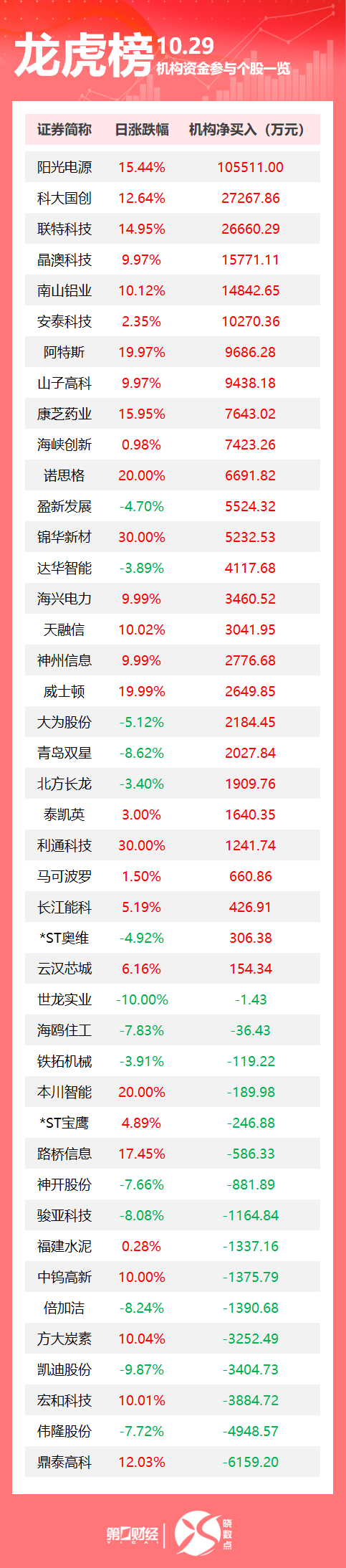 龙虎榜机构整体交易概况 - 10月29日龙虎榜共有43只个股出现机构交易身影 [1] - 其中27只股票呈现机构净买入,16只股票呈现机构净卖出,显示机构整体买入意愿更强 [1] 机构净买入重点个股 - 阳光电源为当日机构净买入金额榜首,净买入金额达10.55亿元,股价上涨15.44% [1][2] - 科大国创机构净买入金额为2.73亿元,股价上涨12.64% [1][2] - 联特科技机构净买入金额为2.67亿元,股价上涨14.95% [1][2] - 净买入金额前十的个股还包括晶澳科技(净买入1.58亿元,涨9.97%)、南山铝业(净买入1.48亿元,涨10.12%)等 [2] - 多只净买入个股涨幅显著,如阿特斯(净买入9686.28万元,涨停19.97%)、诺思格(净买入6691.82万元,涨停20.00%) [2] 机构净卖出重点个股 - 鼎泰高科为当日机构净卖出金额最高,净流出6159万元,但股价仍上涨12.03% [1][4] - 伟隆股份机构净卖出4949万元,股价下跌7.72% [1][4] - 宏和科技机构净卖出3885万元,股价上涨10.01% [1][4] - 方大炭素虽被机构净卖出3252.49万元,但股价上涨10.04% [3] 股价表现与机构行为差异 - 部分个股虽获机构净买入但股价下跌,如盈新发展(净买入5524.32万元,跌4.70%)、达华智能(净买入4117.68万元,跌3.89%) [2] - 部分个股虽遭机构净卖出但股价上涨,如鼎泰高科、宏和科技、中钨高新(净卖出1375.79万元,涨停10.00%) [3][4]